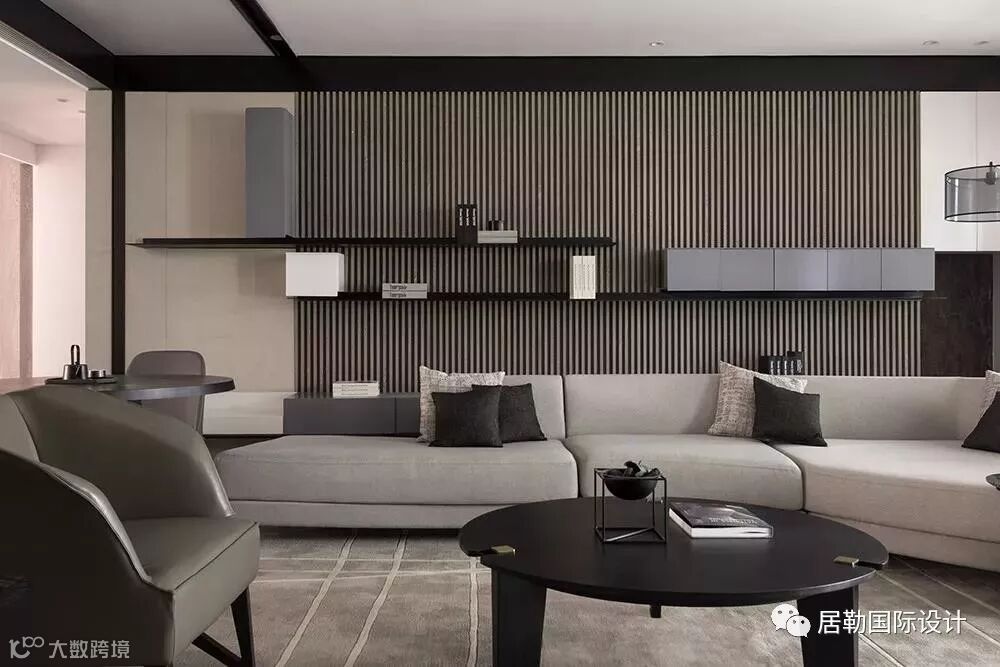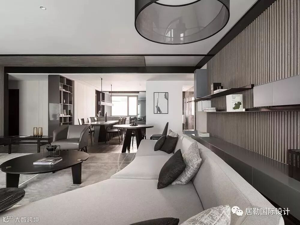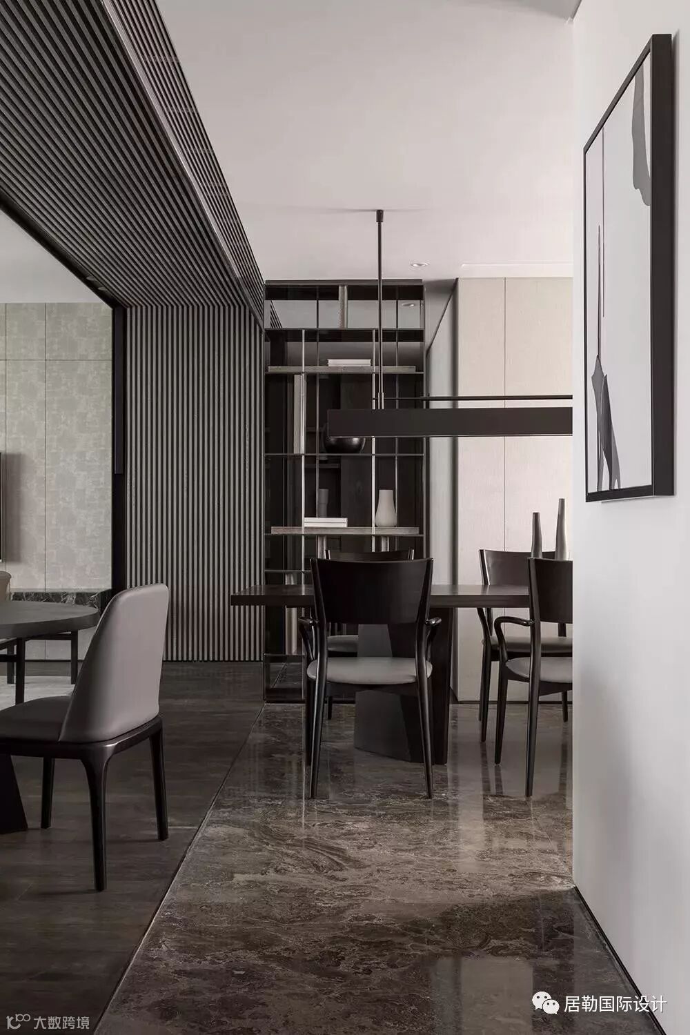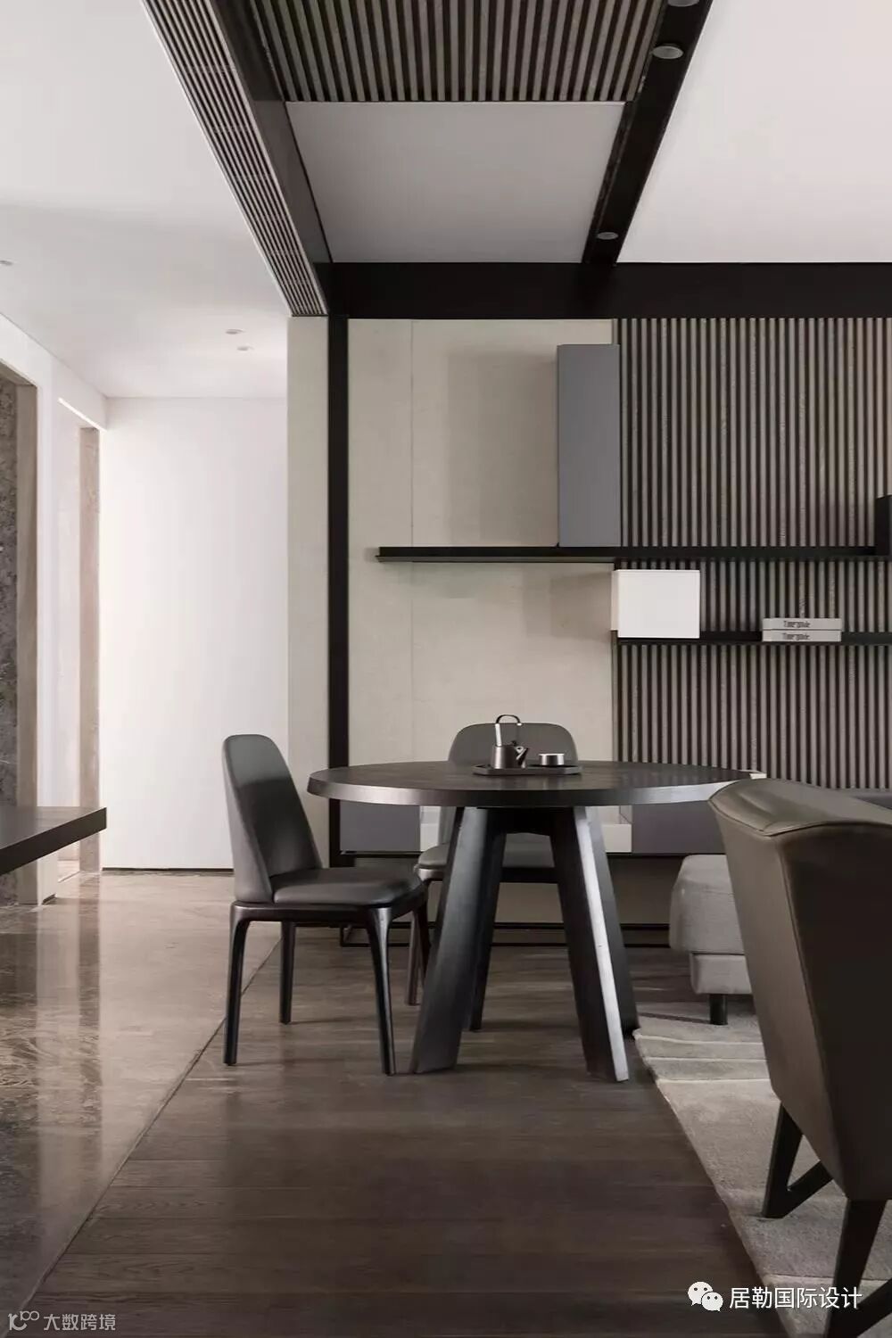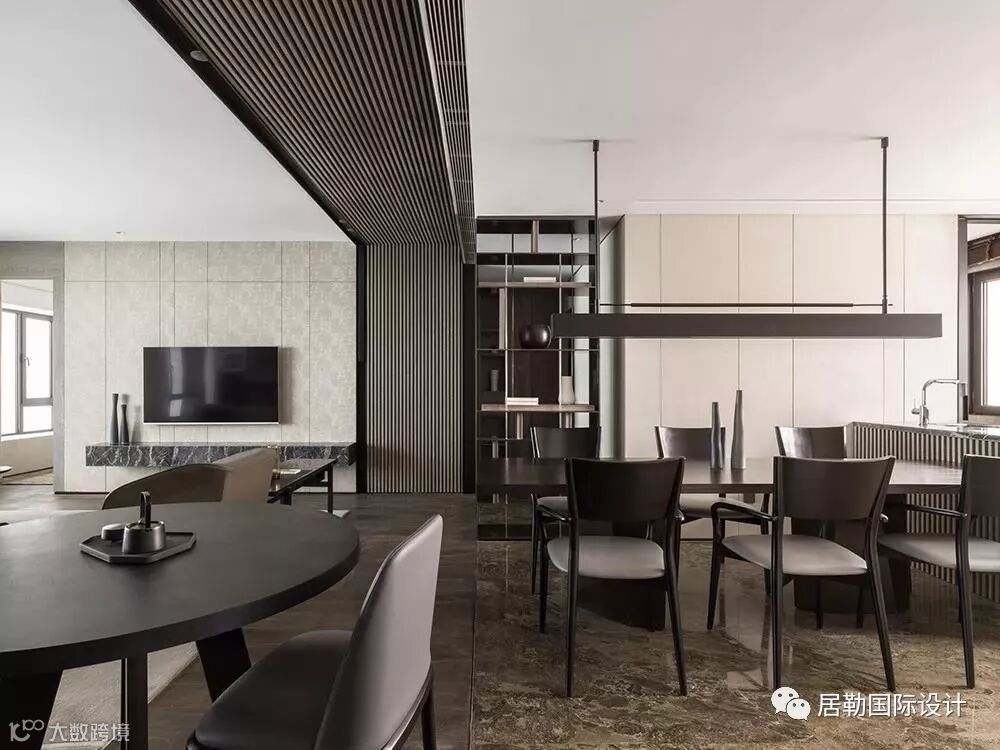 另外,被设计成黑色直纹表面的纹理天花板,将客餐厅两个空间用景深视觉感,这样两区一体的层次感,会形成隔断和延伸效果。