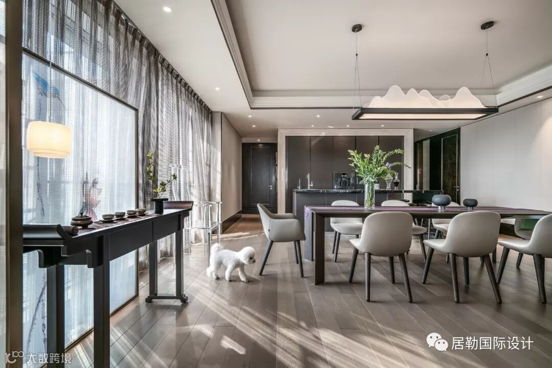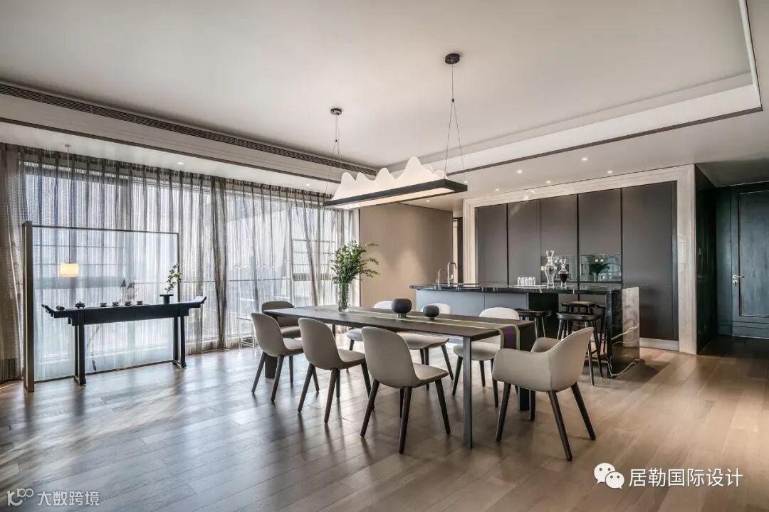 餐厅延续会客厅空间的基调,臻选意大利 Poliform 餐桌椅,精致的亚克力山水造型灯饰,以简单的形制礼遇生活之美。