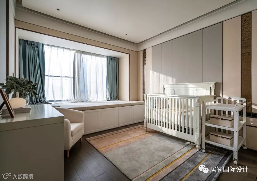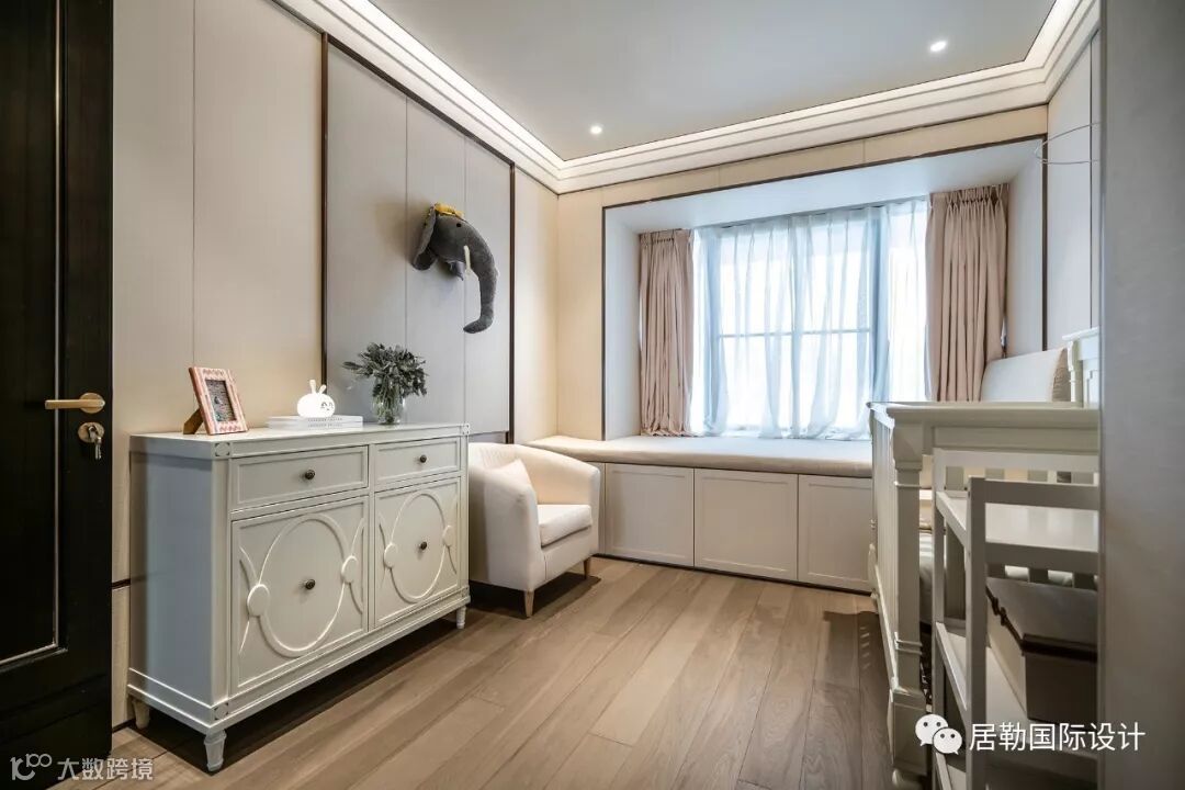两间婴儿房以淡粉与水蓝作为区隔,配备成对的婴儿床、衣橱,还有一件件童趣别致的玩具。在设计中,贯穿着对未来生活的考虑,为居住空间留有成长与进化的可能。婴儿房及儿童娱乐室均在背景墙的设计上做了预留手法,随着孩童的成长,家长只需将家具进行替换,无须进行二次装修。