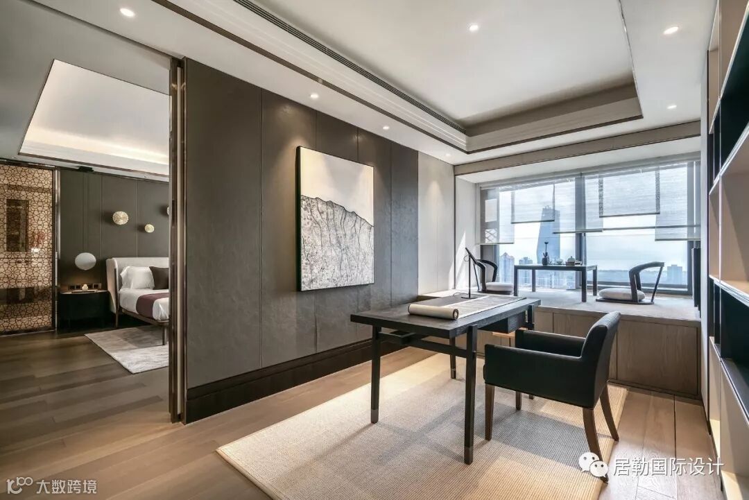 约64㎡的通透主卧套房设计,以三进的方式将书房、卧室、主卫进行构设,使空间具备更好的秩序感与私密性。书房以简净的黑白色调对话,现代极简语汇与中式情韵在空间中相融相生,分外静雅。飘窗区被设计为茶室,原木、清茶、松叶、花卉交汇在一起,清甜而微香。晨间的日光柔和,夜晚的月色明澈,一杯清茶,共待流年。