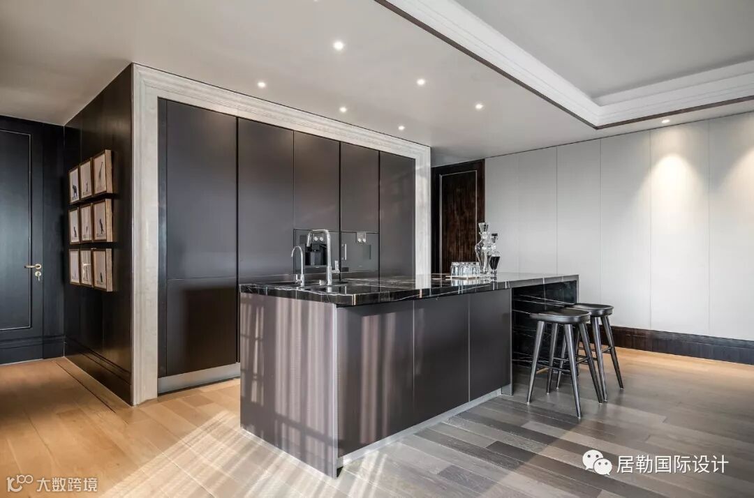 西厨岛台采用大理石与木材无缝贴合,睿智的黑在空间中焕发着张力,突出设计臻选的态度与品质的精尚。