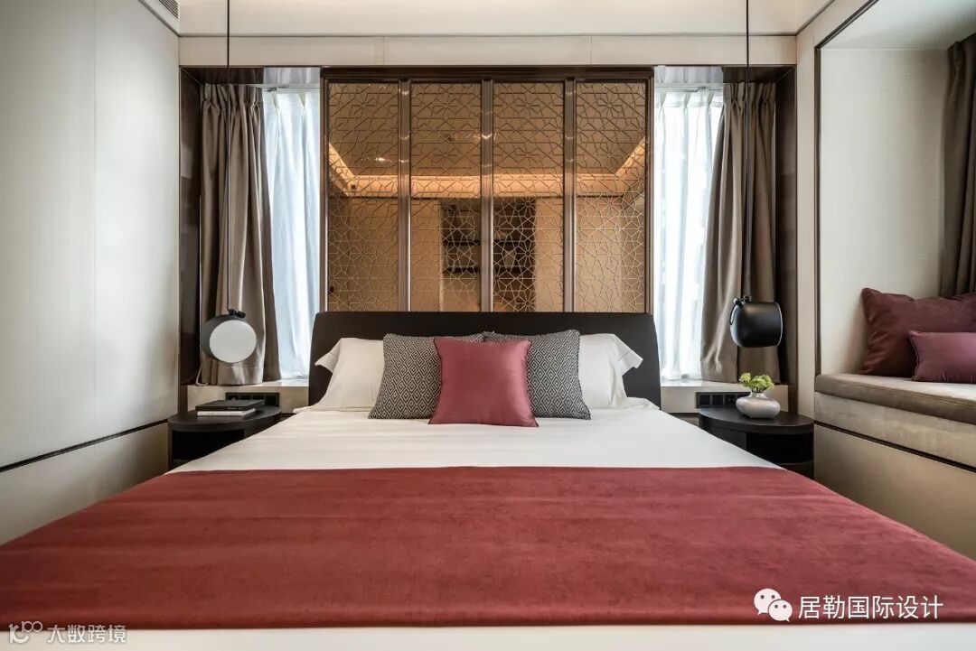 次卧两面超宽窗台,纳入朗阔无垠的好景,空间格调疏朗气清。设计师发挥了创意想象,将一块深色亚克力隔板做成床头背景墙,巧妙利用空间之余,亦保留了空间尺度的敞阔感。