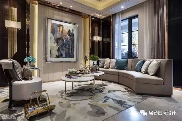 放眼望去,客厅里大量的新金属、新建筑材料、石材等材质相映成辉,共构奢华气质。黑、白、灰的色彩基调,融合各种金属质感的简化线条,高贵而大气,时尚而前卫。家具的选择也十分考究,从材质到款式的每一个细节都做到恰到好处,细腻缜密的布艺、木材及金属的优秀品质,是豪华、奢侈生活方式的象征。还有各种带有时尚魅力的陈设元素,极受追求时尚的精英人士的喜爱。