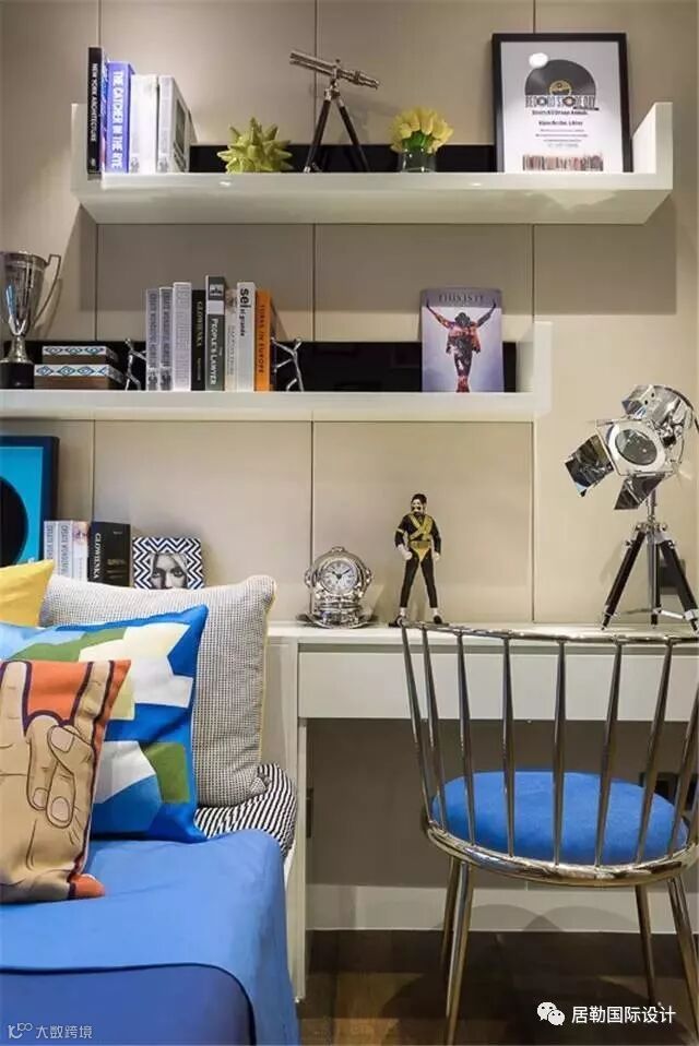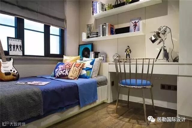 这是个充满梦想与快乐的空间,一把吉它,一个天文望远镜,还有那铺满幻想色彩的陈设场景,美得如些纯净的蓝色调编织着男孩的童年。