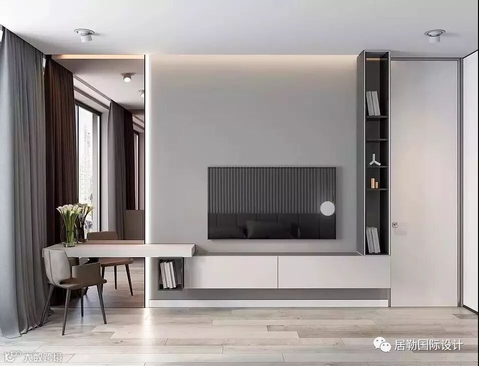设计师在空间中应用了木色与灰色,低饱和度的灰色与灰色很好的融合在一起却还是空间的亮点,空间细节也更奢华且具质感。带有木质光泽的材质,深浅搭配,层次鲜明,创造满满的艺术质感。