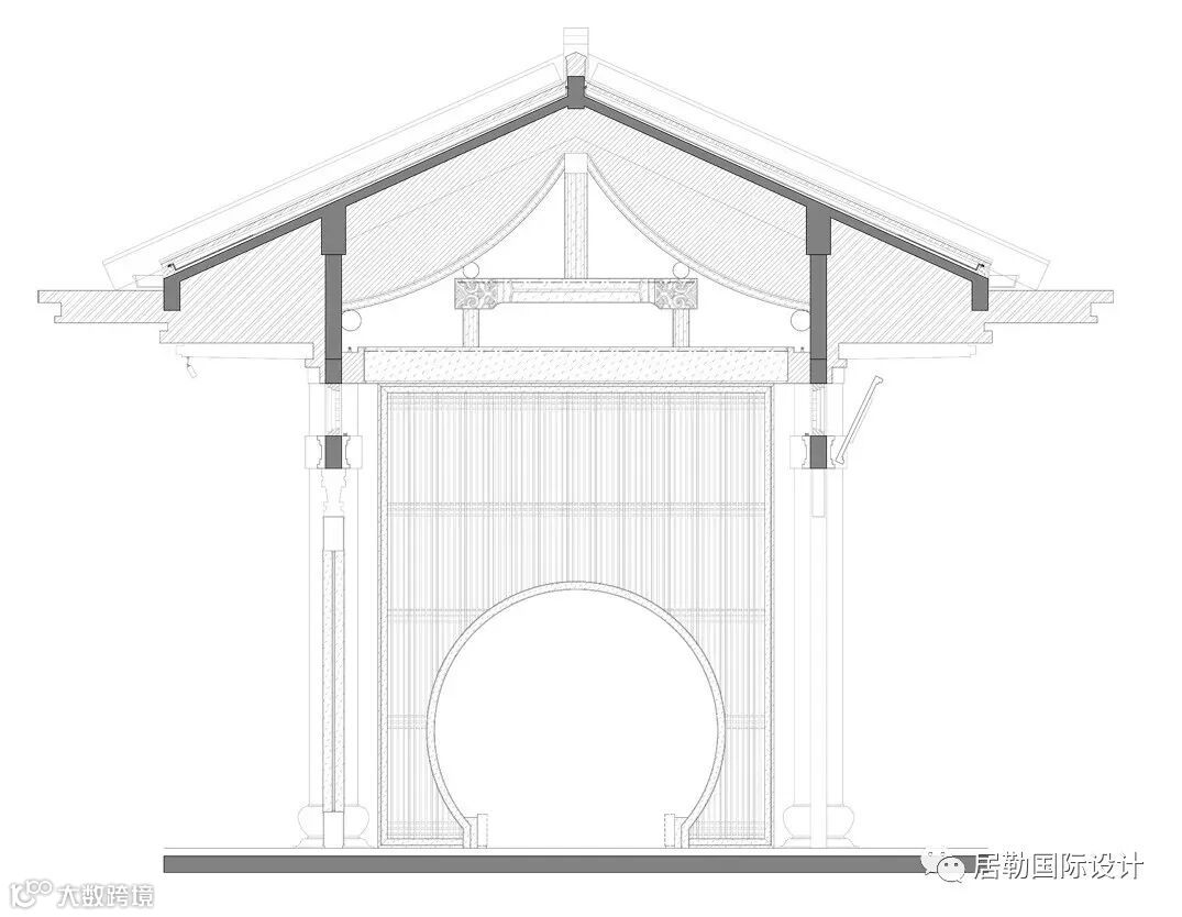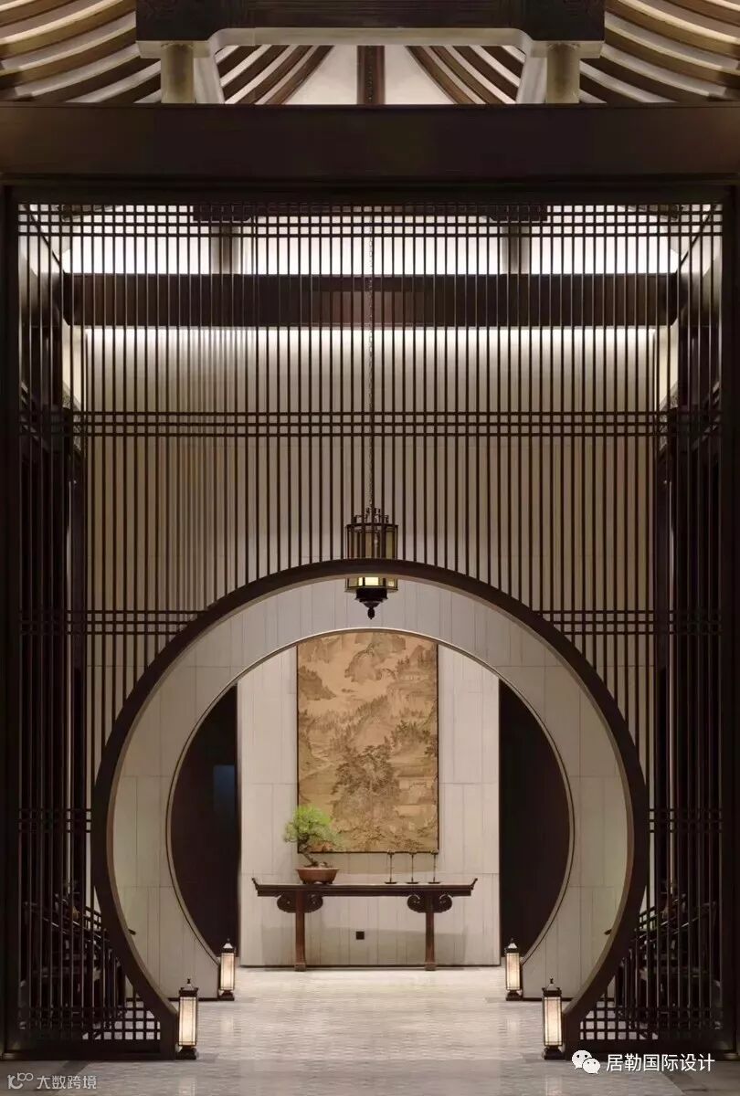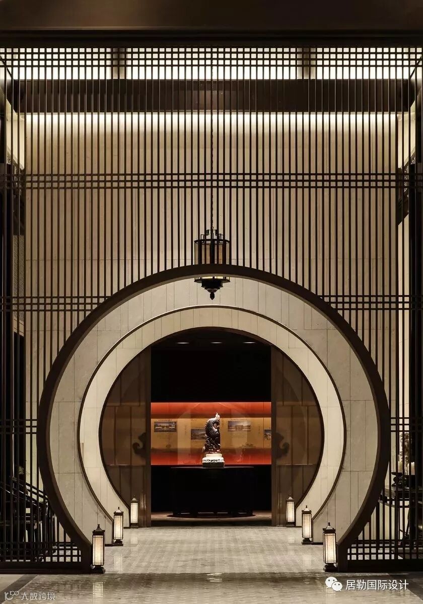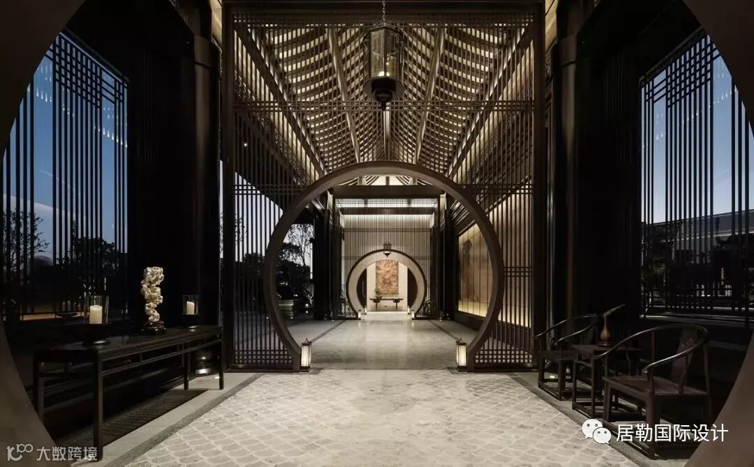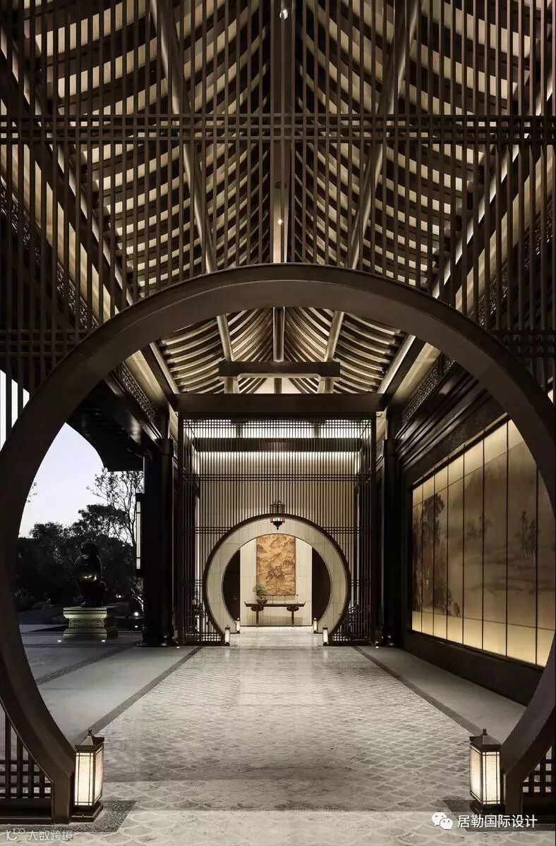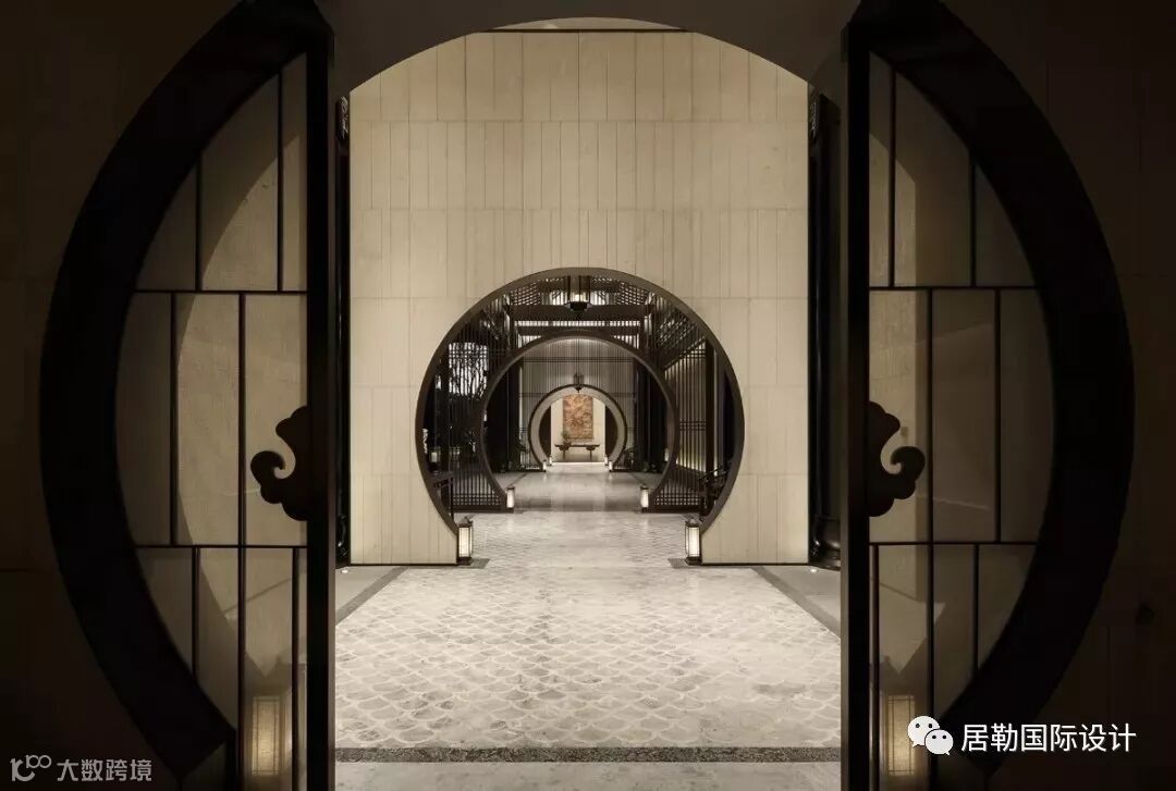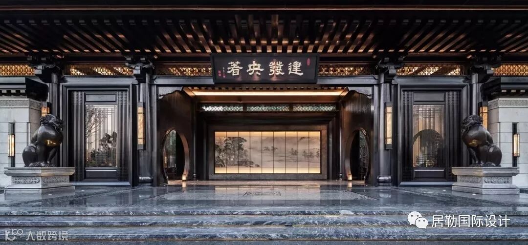 地面采用鳞片状石材拼贴,贯穿门廊,形似龙身 ,为鱼跃龙门之意。正所谓高门阔府巍峨而立,雕梁画栋,层层序列,营造归家的仪式感、尊贵感,入廊穿月、踏浪而行,既有金石之贵,又有林木之雅。