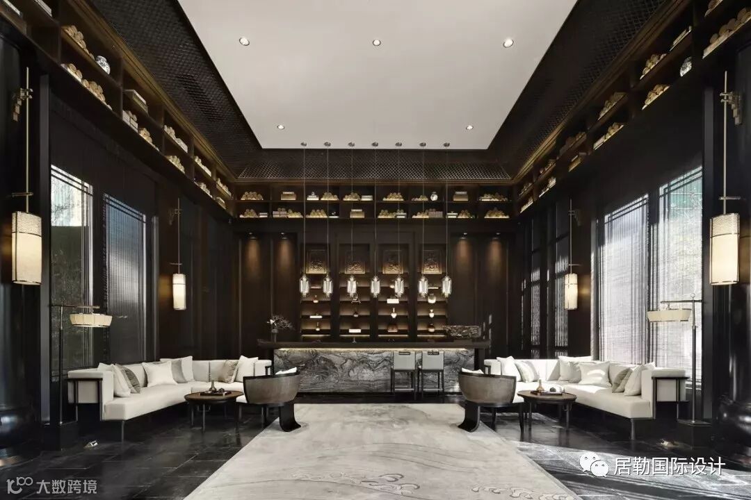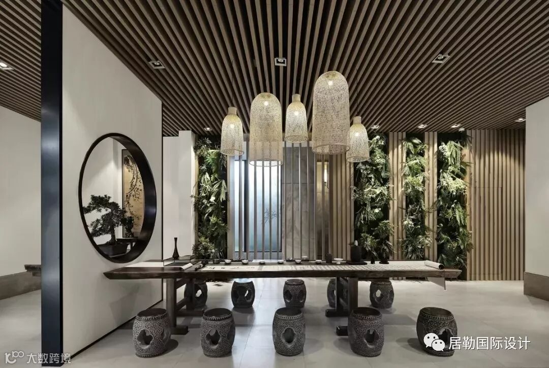 中国古人的生活与自然有着亲密的联系。我们打造精致的半户外的活动空间,来满足都市人对于自然休闲的生活追求。架空层通过格栅与绿植墙的处理,使空间隔而不断,倚靠清池边,点点游鱼拨树影,营造出「翠痕过墙,引春入庭」的氛围。前区为公共客厅,招待亲朋好友。月洞之后为休闲区,三俩好友,一壶清茶,邀约同坐,尽享闲暇午后。或独自捧书一本,倚坐一角。满室乐趣,可游可居。