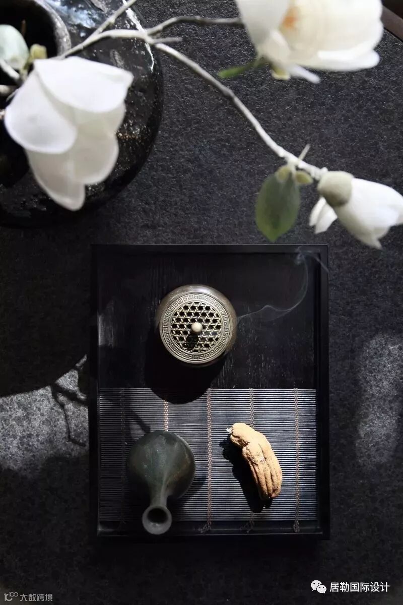 书斋是古人度日读书居留最久的场所, 文人士大夫博学好古,以文会友。散帙,焚香,可谓心之所向,素履所往。此空间采用悬置的书架,其中摆放卷轴古籍,万书环绕,营造书院的氛围。茶几摆放沉香,焚香与茶事的组合,可谓清心悦神。空间相承古代礼序精髓,将传统文化自然融入设计之中。