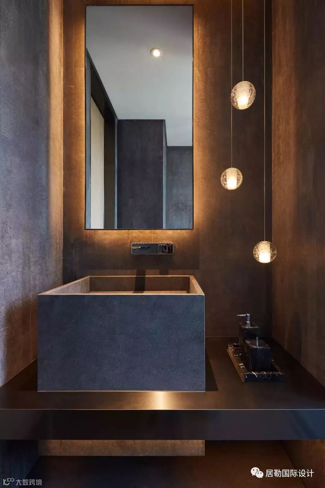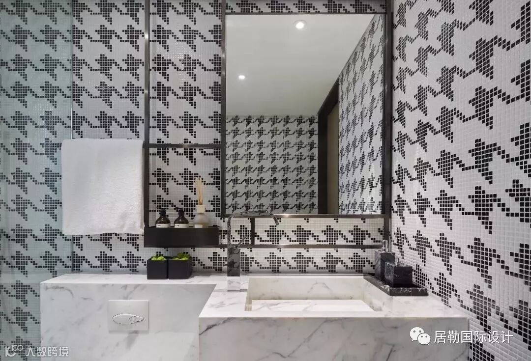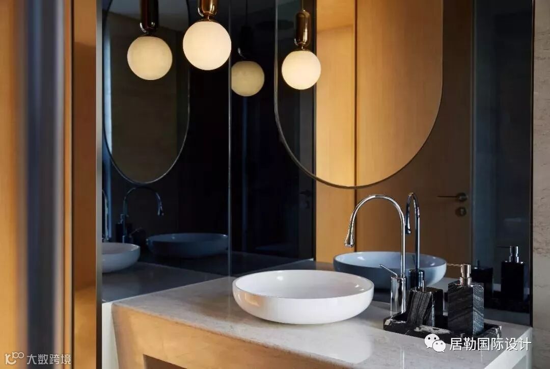 刻花玻璃与不锈钢勾勒客卫的递进层次,落地镜面有效缓解局促感。水滴状吊装龙头由顶端垂落而下,与圆柱台盆互动,硬朗酷炫,堪称点睛之笔。“注入不规则手法,无形之中发生空间对话及律动,赋予其不同情绪。”