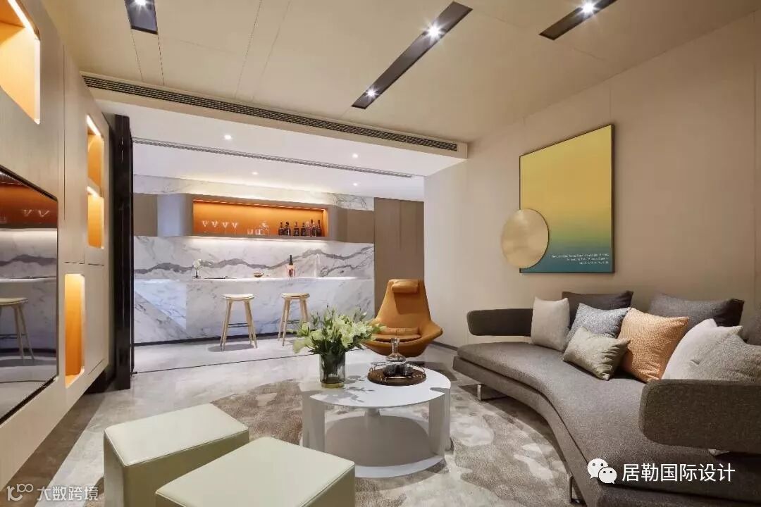 家庭厅玻璃折叠门闭合,随即转换为独立空间,强化空间的灵活适应性以及开放融合性。或品酒畅谈、或欣赏影音,诠释生活的欢愉和多彩。