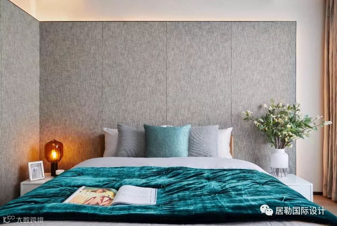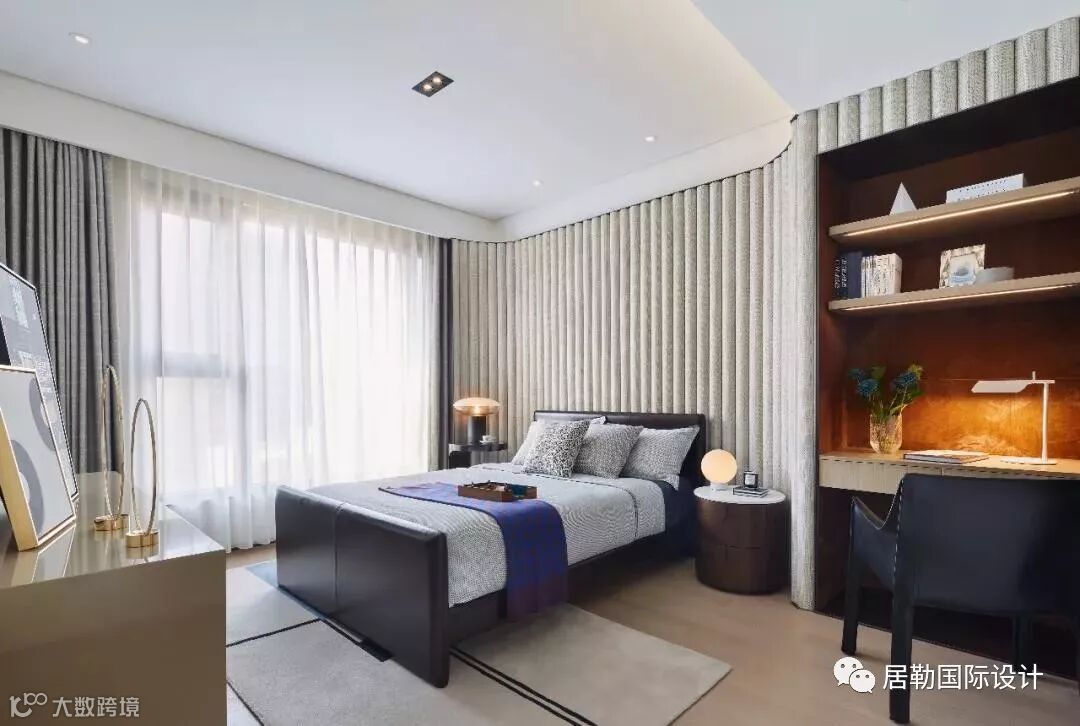 书房、主卧、衣帽间、卫浴共同组成独立的大套间,私享静谧空间由此开启。主卧立面墙布延伸至顶面一体化呈现,藉此拉升竖向高度,下方同色系木格栅创造出横向序列感,让造型独特的主卧更添艺术美感。