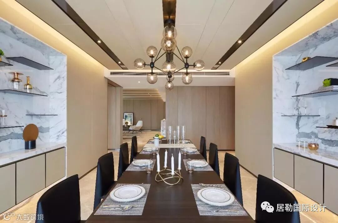 餐厅吊顶延续客厅手法产生视觉韵律。利用餐桌两侧立面非承重墙,打造内嵌式置物区,以金属钢板插入石材的形式错落分布,同时白色大理石背景与米色硬包、木饰面相辅相成。