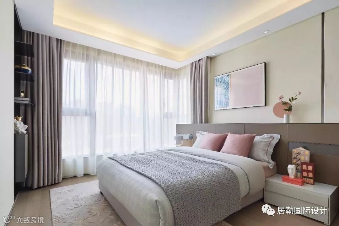 女孩房床品、背板、立面三者关系竖向递增,加以莫兰迪色系调剂,氤氲出柔情与细腻,在日光的晕染下更加温婉可人。其卫生间内圆润曲线在多重镜面的映射下,宛如梦幻之境。