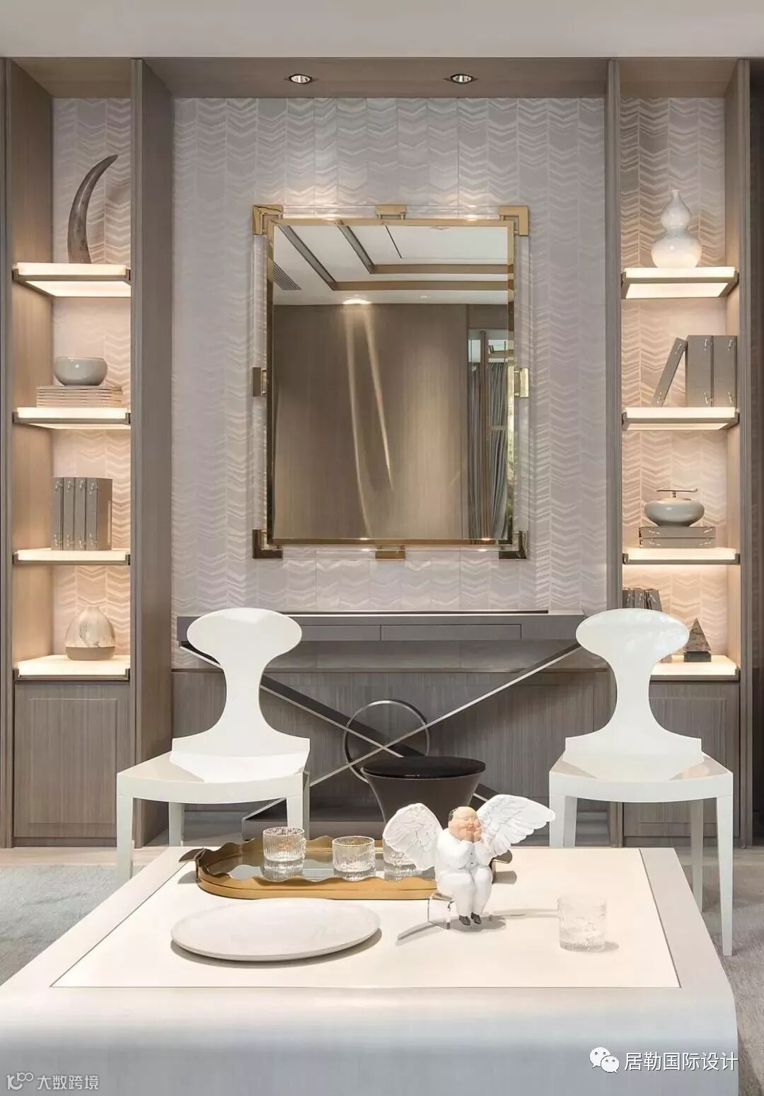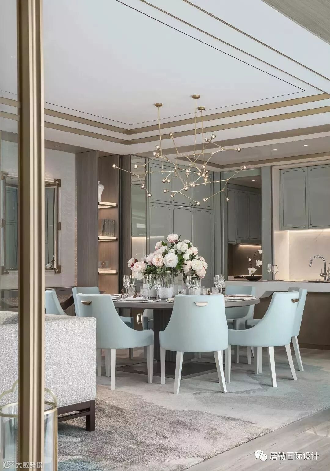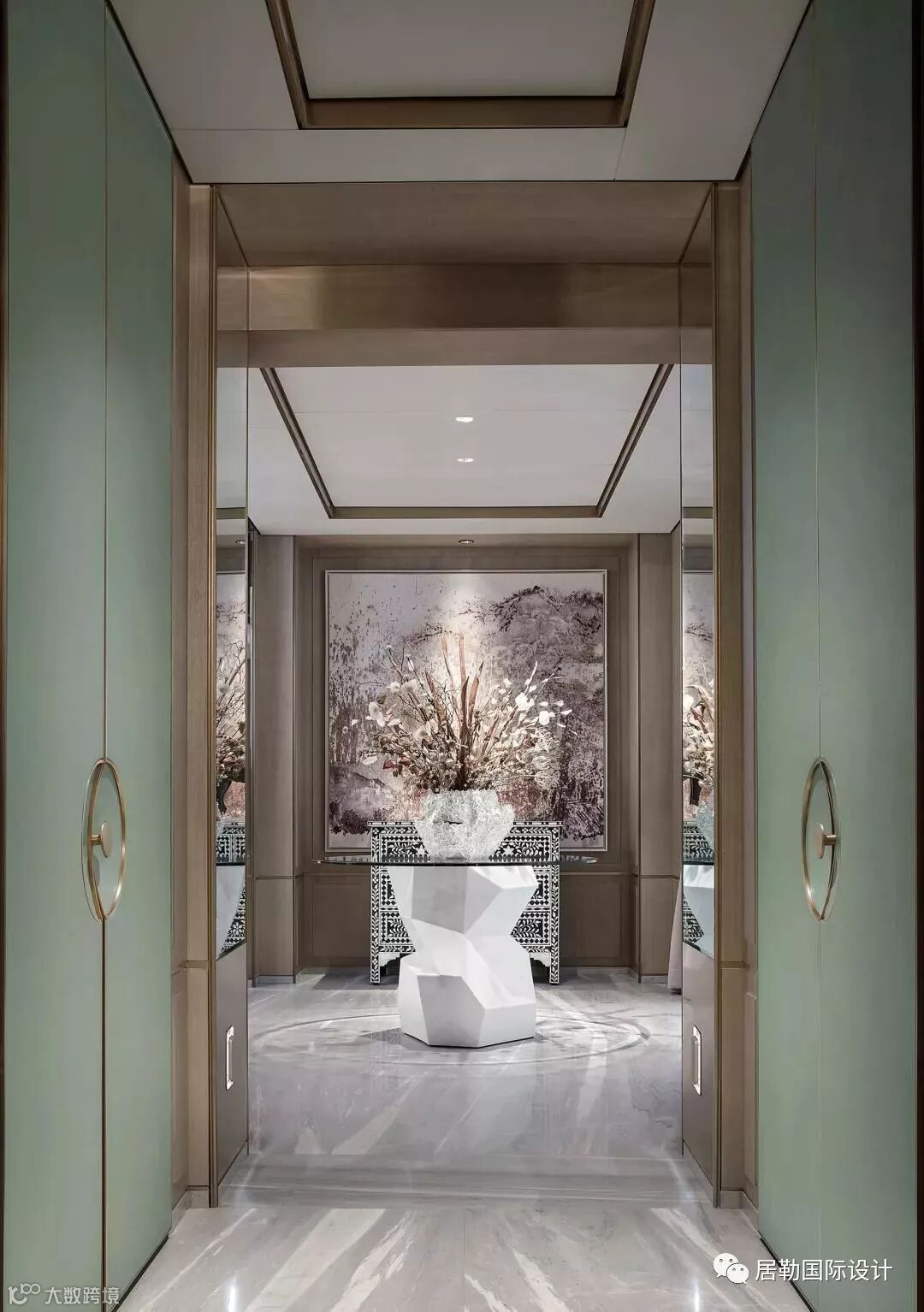 基于契合设计主题及增加空间层次的考虑,软装配置选择了造型简洁又有东方韵味的配置,色彩上以白色、冷灰色作为呼应,并着水绿点缀。