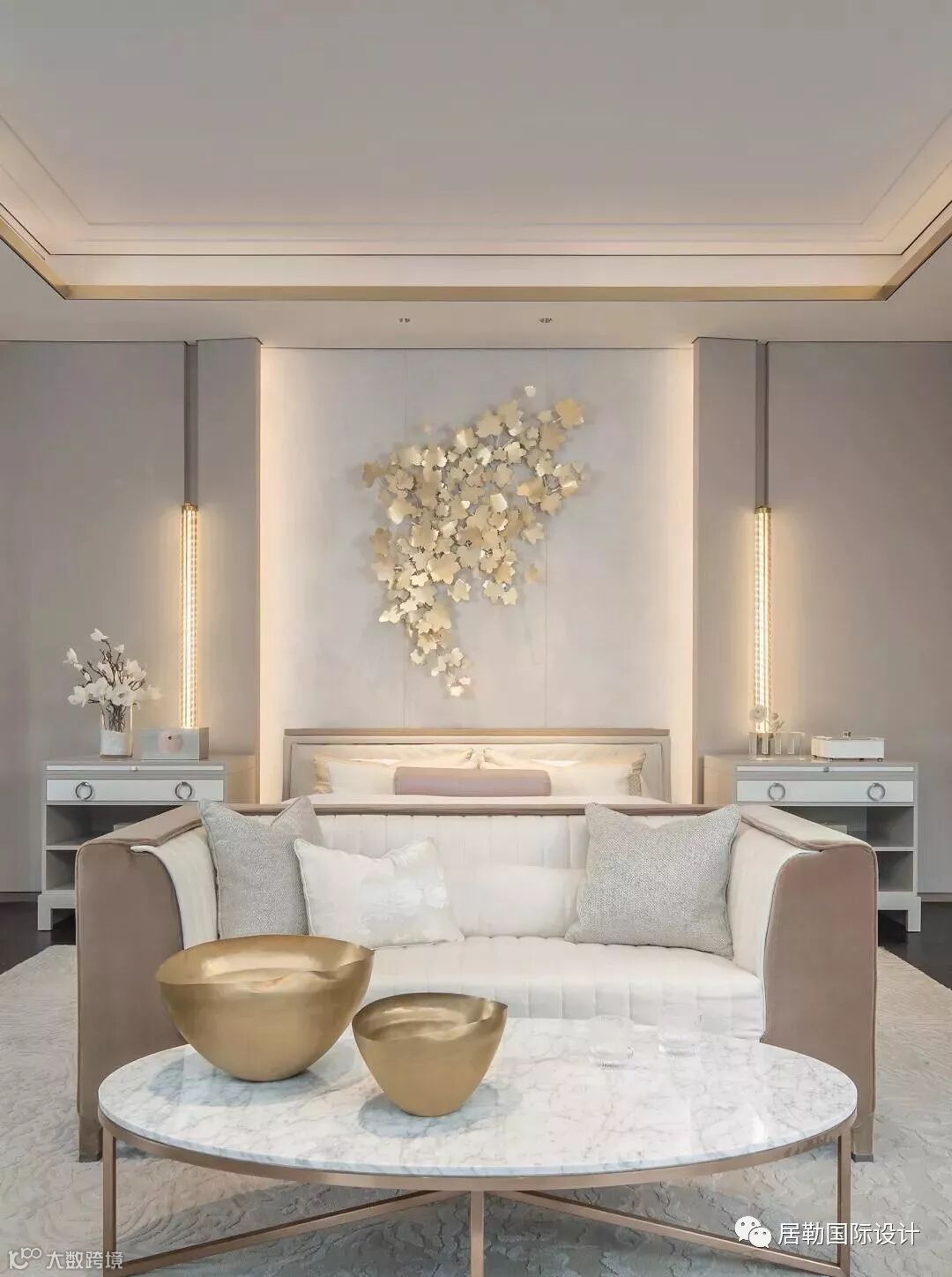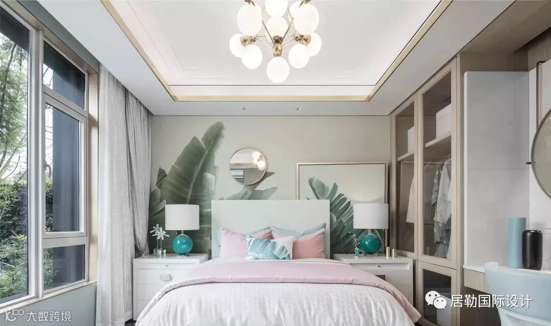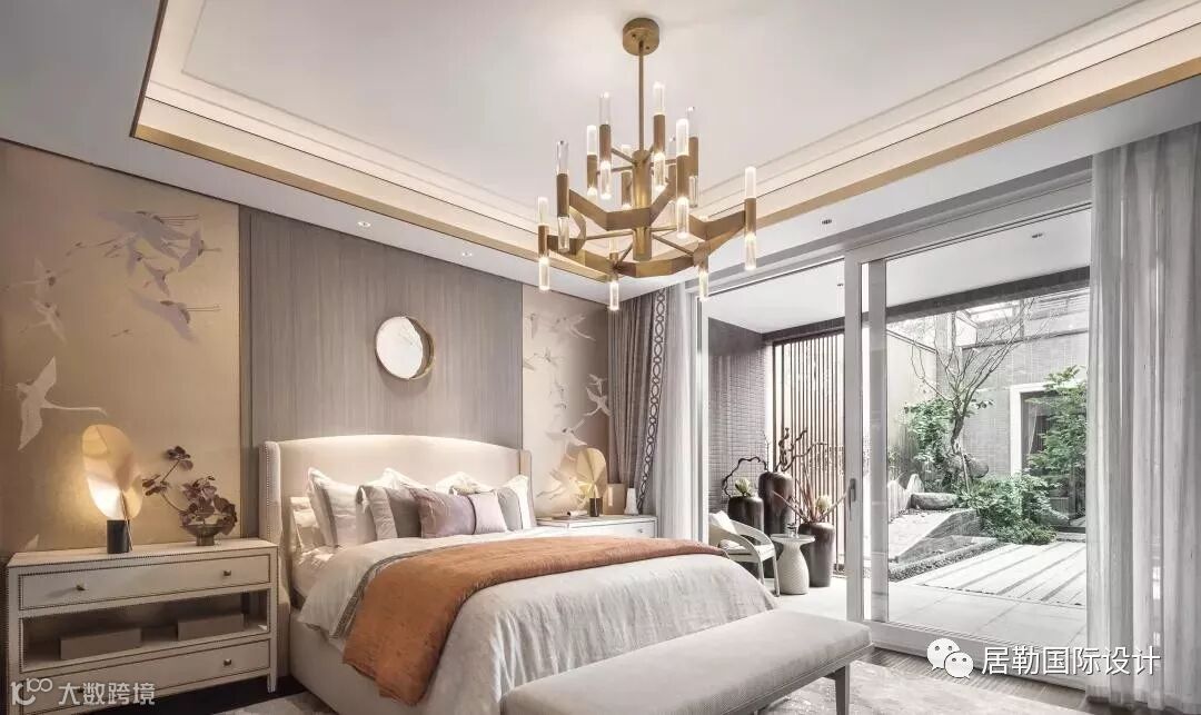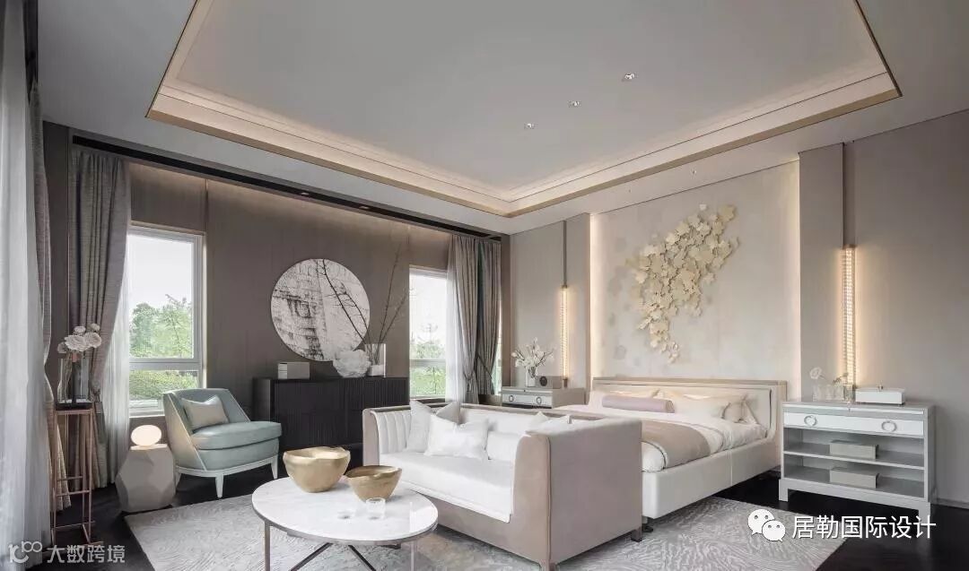 主卧室拥有足够宽敞的面积和明亮的落地窗,其设计重心为突出强调空间的艺术品味,追求雅致宁静而不失细节的空间体验。
