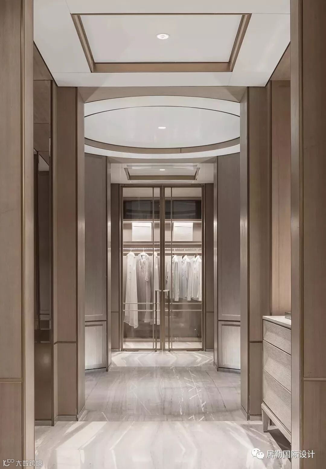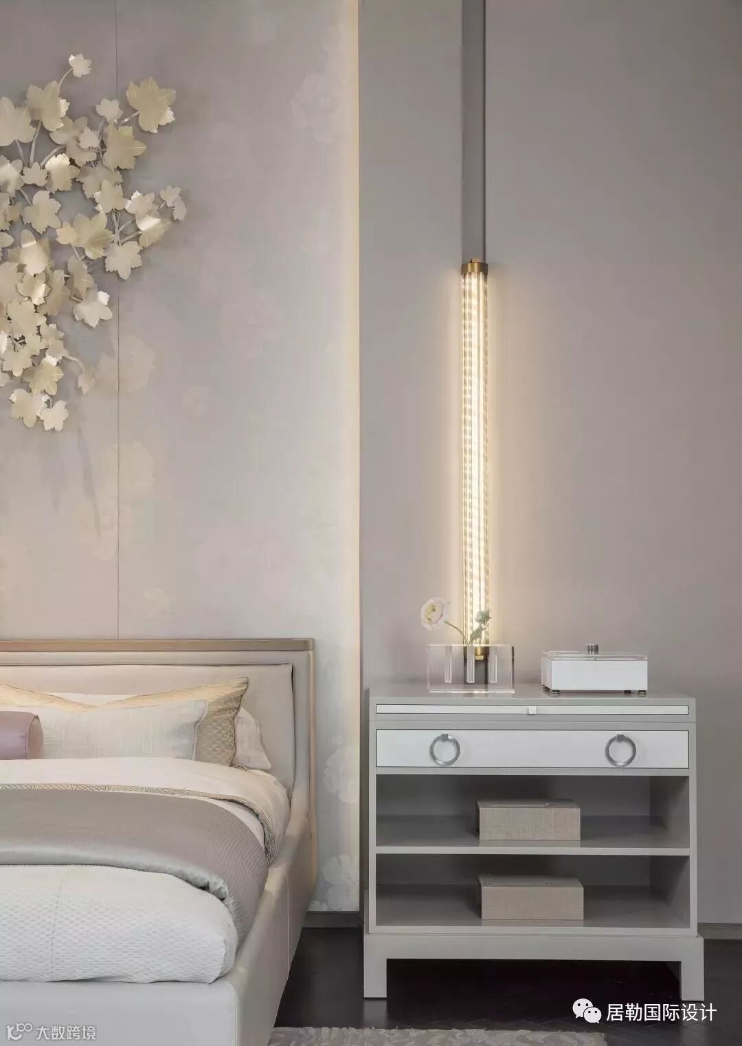 以灰色染色木皮搭配精致的金属质感的铜合金线条为基底;背景墙则选用了两种不同肌理的灰白色壁布,丰富了层次的同时也衬托了清新淡雅的空间氛围。