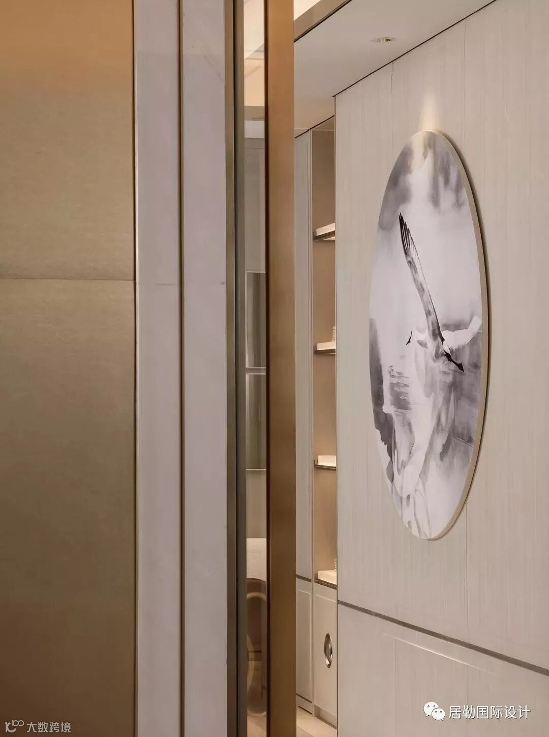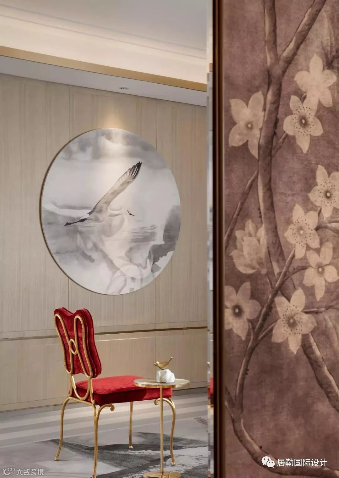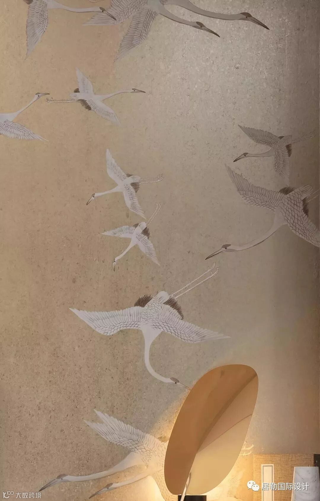 这里的主题被设定为水墨仙鹤,并结合树林图案的手绘壁纸、银杏落地灯灯等抽象自然元素,强调师法自然而又不乏时尚的女性气质,创造出儒雅端庄的空间感受。