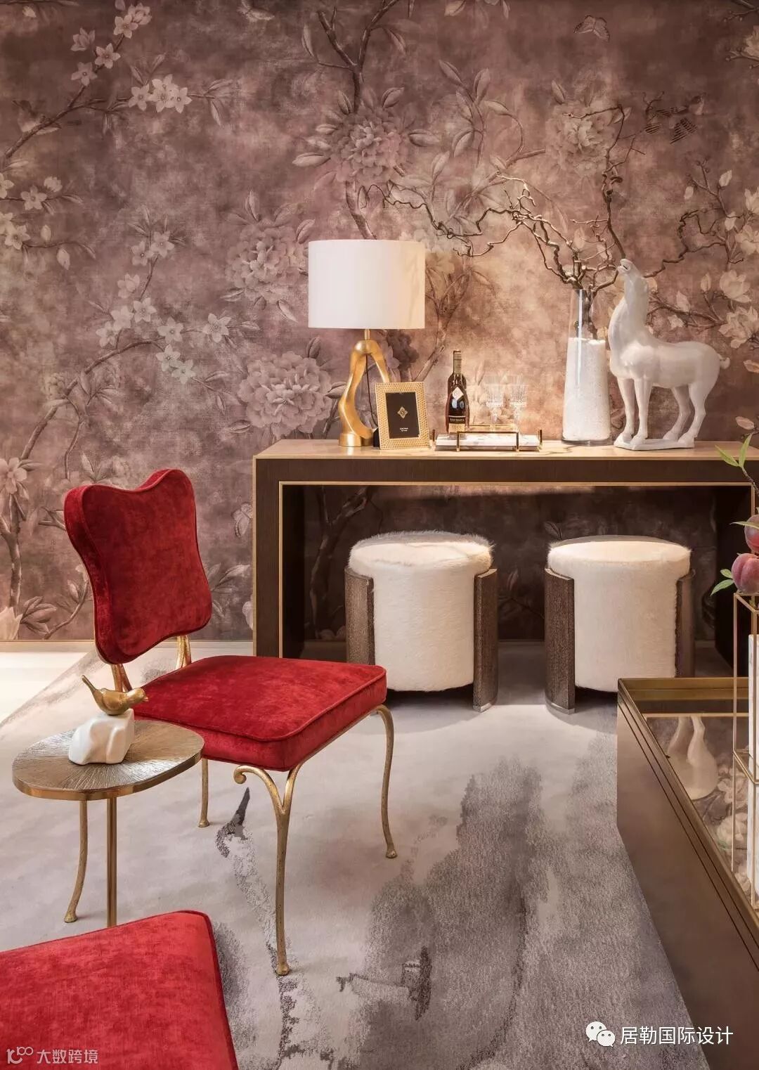 灰色满铺毯上点缀的灰粉紫色、长桌上的粉色花艺及坐榻上色彩清新的靠包也为沉静的空间点缀了少许活跃感。