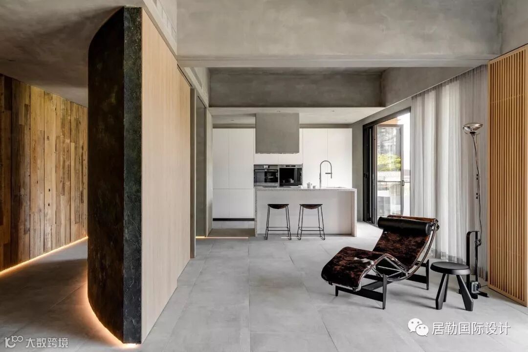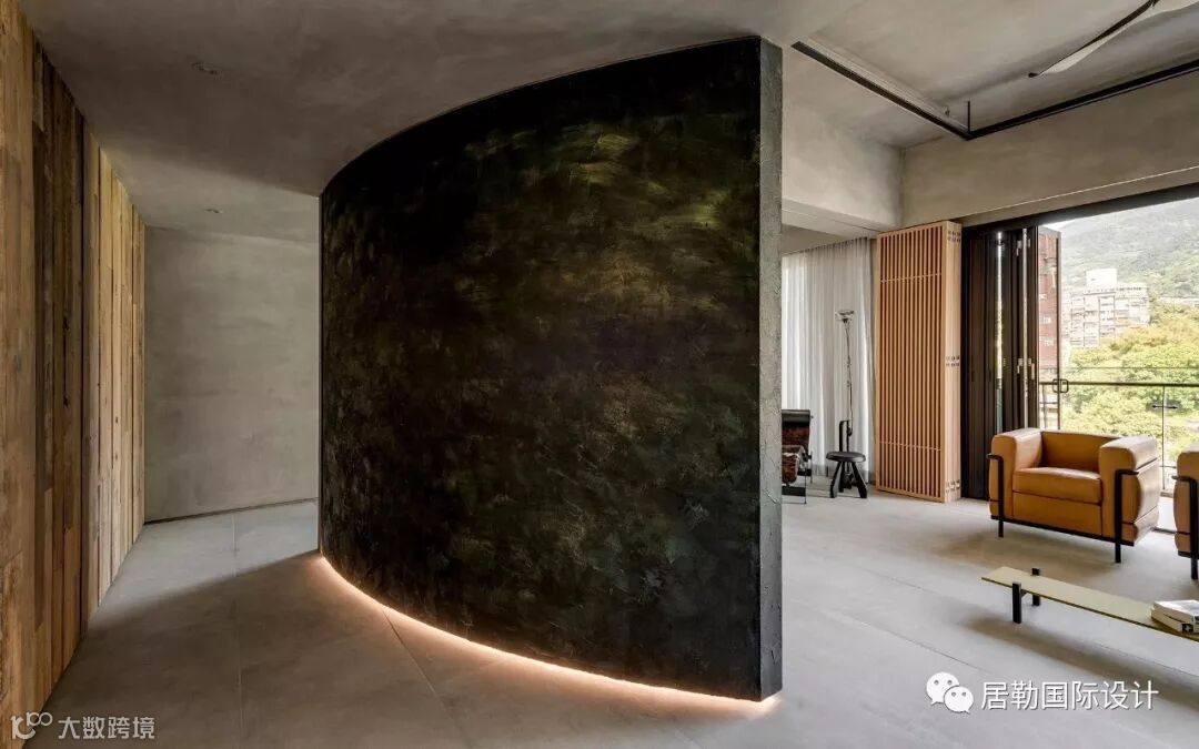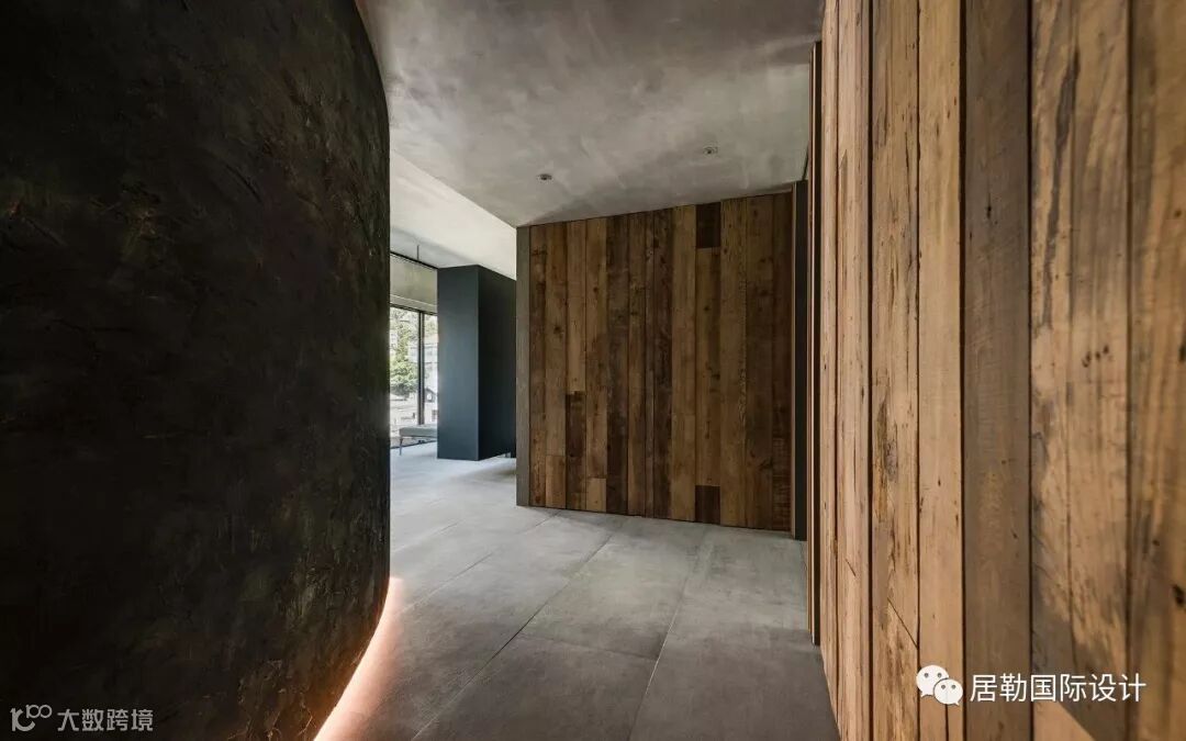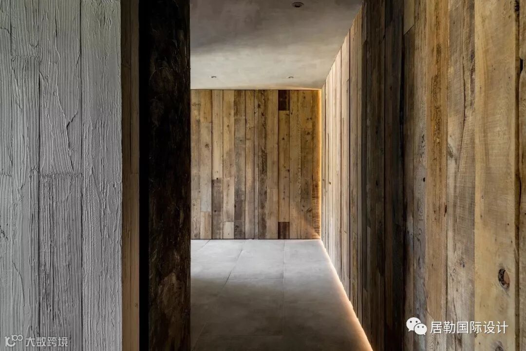 具有岁月凿痕的回收旧木料(台湾原生树种老桧木),与特殊水泥质朴亚光的沉静材质表现来做成空间的形塑,除了满足生活需求外,更将居住者对于生活记忆的点滴印记,传递在这个空间里。