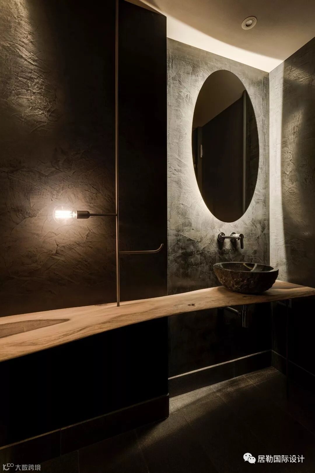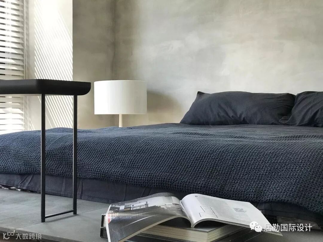 以灰白水泥质感为基底辅以温润浅木质的主卧房,简易、雅致,整个空间透露著一份淡淡的谧静氛围。而客用浴室,以暗黑色呈现。具纹理质感的马来漆,自然成型的胡桃木实木桌面,在铜质结构的支撑下,悬浮于空间中。