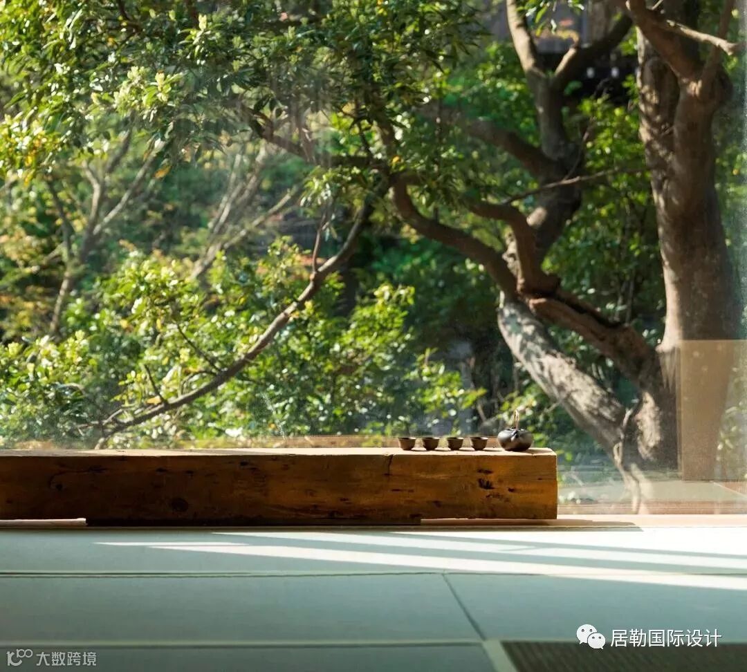 远山绿意和原生树前后呼应,开放空间中家俱的样式及陈列,使得场域的界定模糊,室内外连成一气。入口处飘浮的蓝灰色柜体,界定了场域,也形塑了动线。
