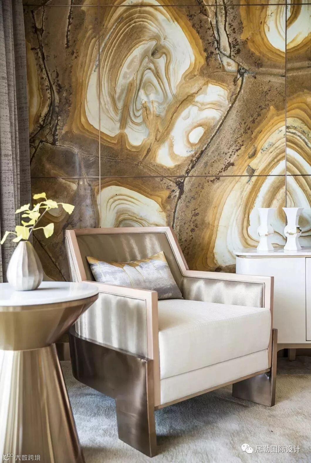 客厅背景墙采用巴西进口天然石材,自然的肌理纹与户外山湖景致相呼应,除此之外,设计师极力摒除多余的色彩、造型,以减少视觉上的局促。