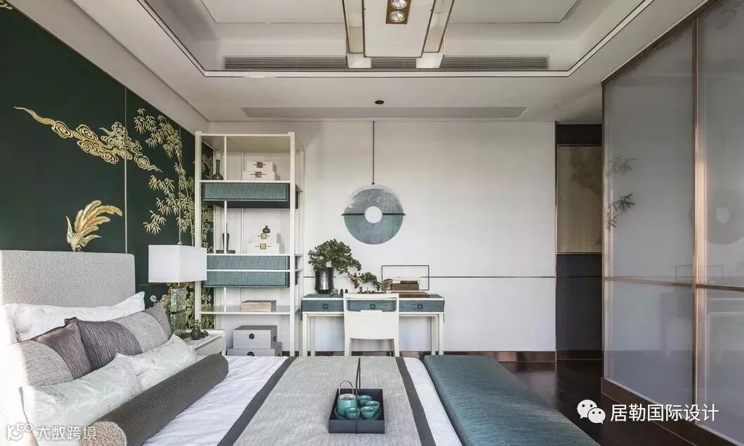 长辈房以白灰布艺中点缀了青绿色系,低调优雅,以石竹、祥云为衬,凤鸾呈祥渊源共生,和谐共融,灵动贵气,彰显老人房的安富尊荣,演绎一场生机盎然的写意自然景象,一段奢华与禅韵的邂逅,运用工笔画加刺绣的工艺技术让内容更加丰盈耐人寻味。