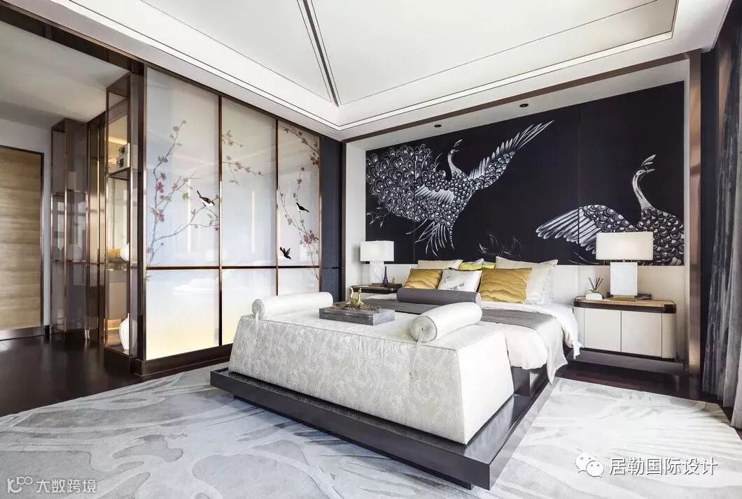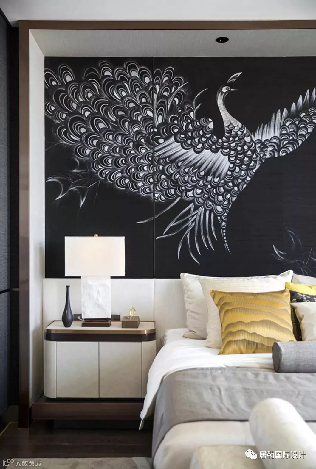 主人房主幅取“仙鶴”之意,換為“鳳凰”之形,融入传统 “苏绣”锦画的工艺,描绘出“凤凰”的恢弘大气,细腻的笔触勾勒出集美与富贵为一体的高贵气质,一束灯光洒落在羽翼之上,闪闪发光的丝线给房间增添了富贵华丽的印象,体现主卧的华丽与尊贵。
