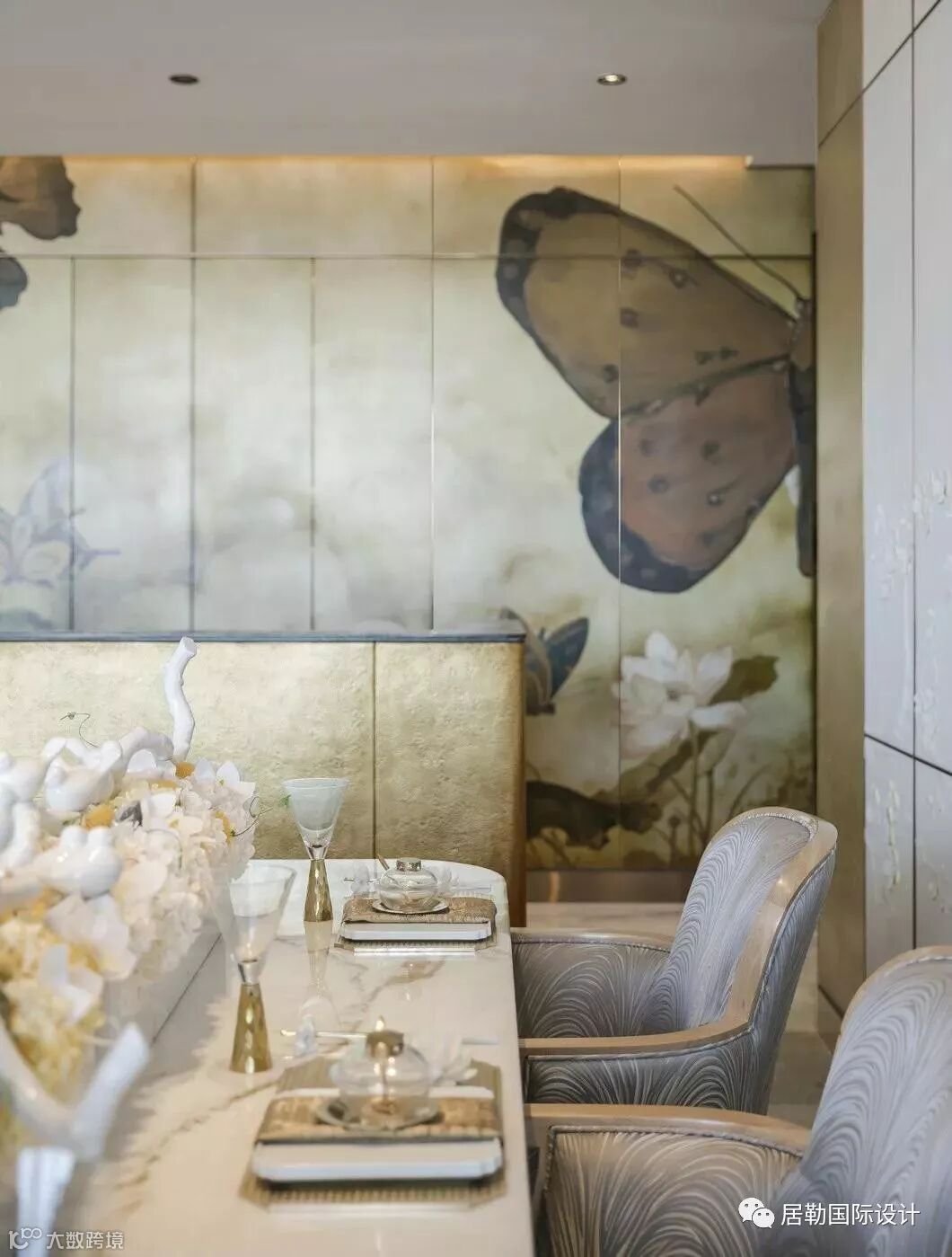 餐厅背景以代表东方文化内涵的梅花为元素,圆月梅花,满载合意。设计师运用皮雕工艺将其演绎呈现,背部的蝴蝶刺绣栩栩如生,仿佛被屋中美景吸引,留恋于此。
