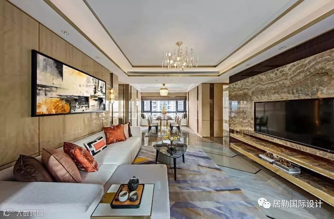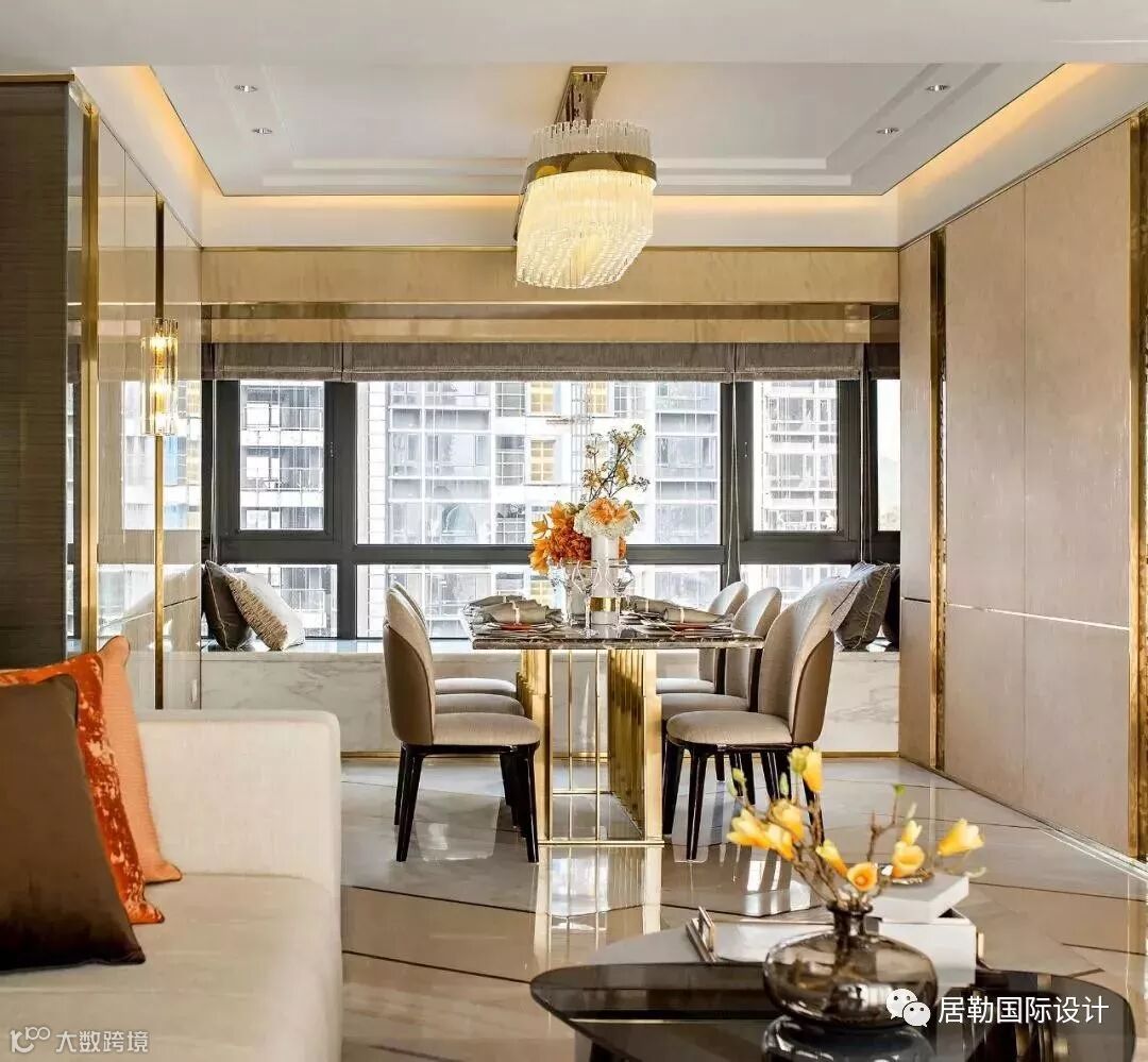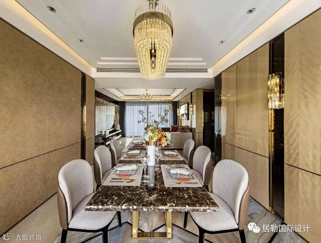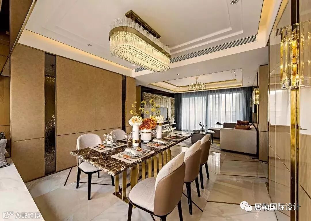 几何艺术首先体现于客餐厅地面三种石材与不锈钢的结合,设计概念来自于钻石的切割艺术,营造出奢华而不失内涵的空间气质。