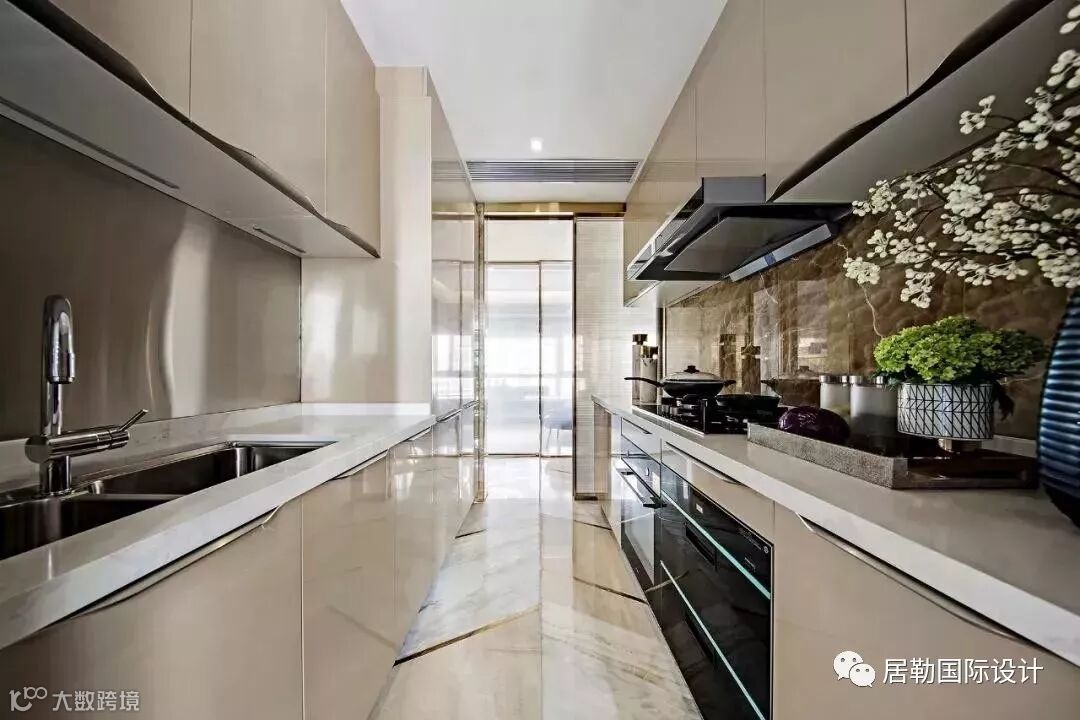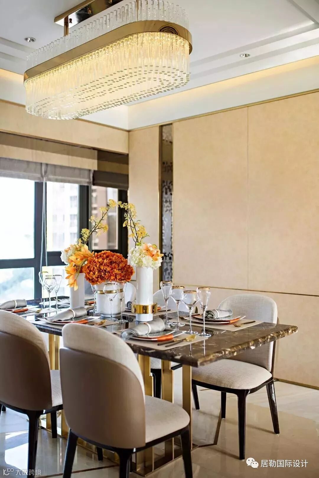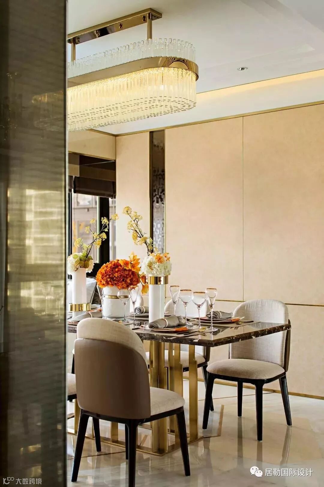 几何艺术首先体现于客餐厅地面三种石材与不锈钢的结合,设计概念来自于钻石的切割艺术,营造出奢华而不失内涵的空间气质。