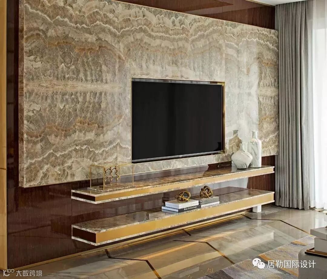 电视背景墙面显现着玉石的天然纹理,与隔空相对的抽象艺术挂画完美呼应。