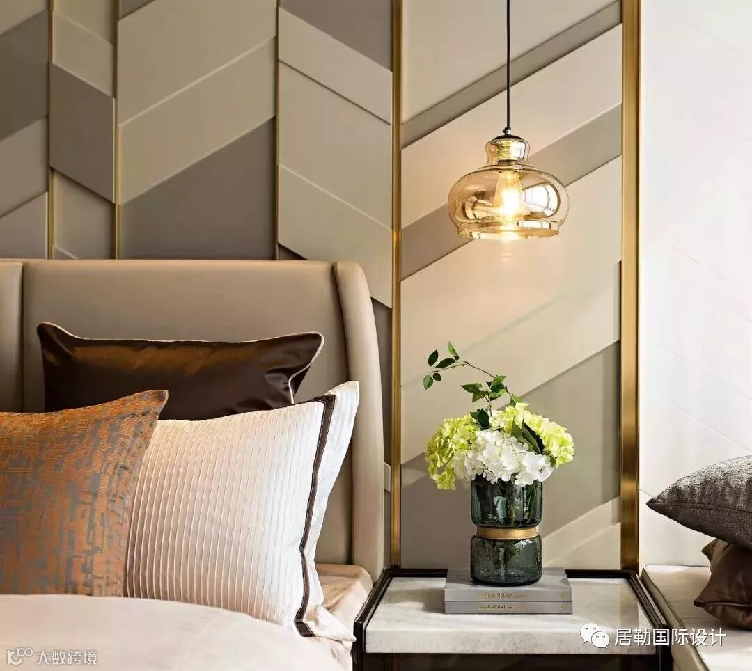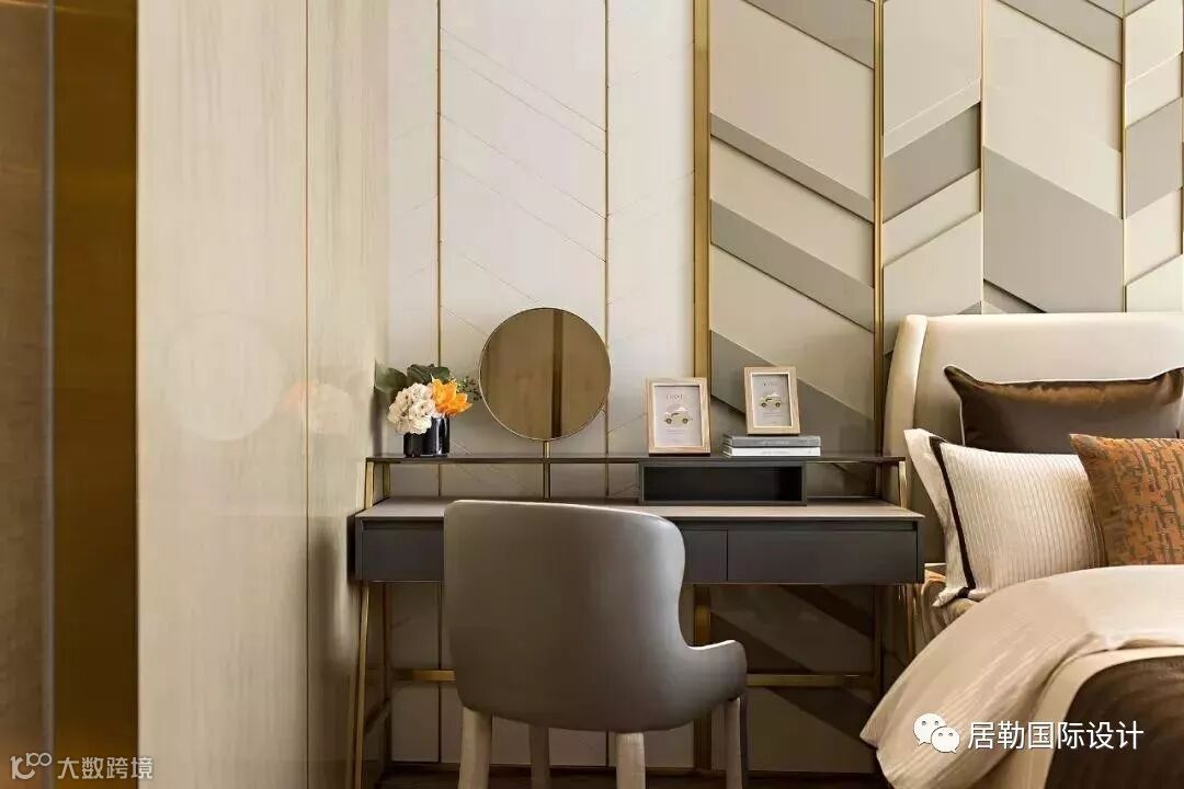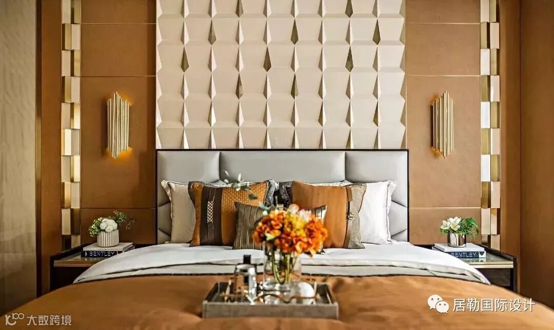 从钻石中提炼出的设计元素亦延续到整个空间铺陈中,包括卧室木地板的菱形铺装方式、床头背景墙的特色几何装饰、墙面镜子的几何刻花图案,以及卫生间的特色马赛克搭配等,共同成就了奢雅却不浮华的家居场景体验。