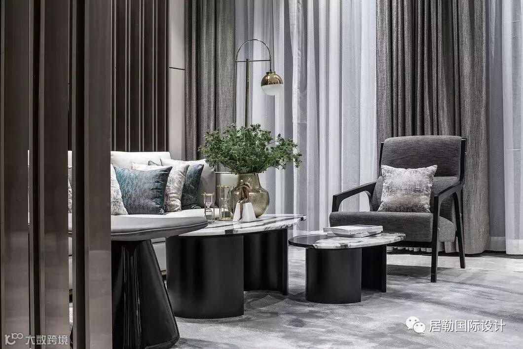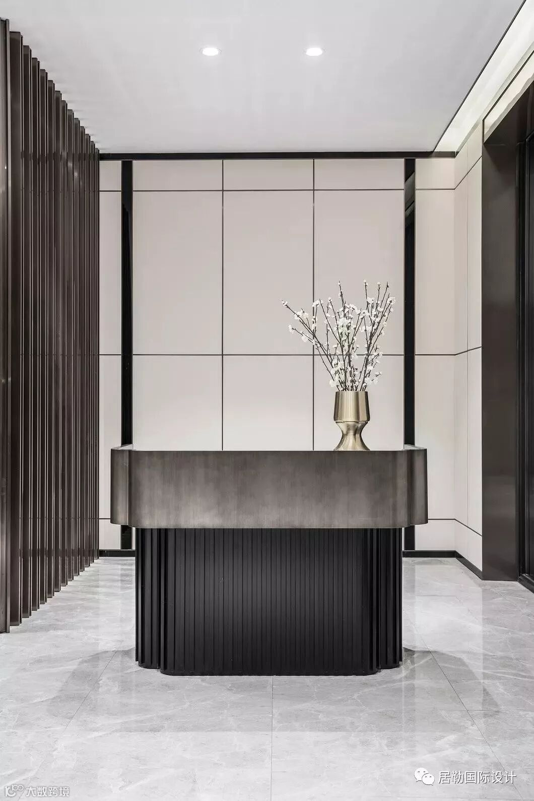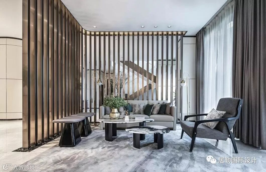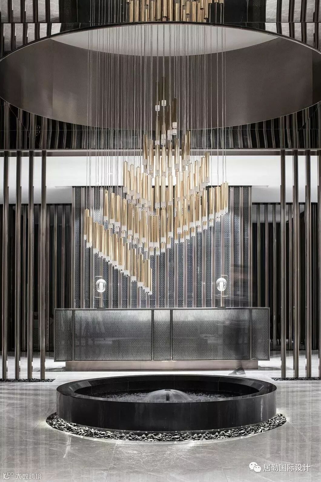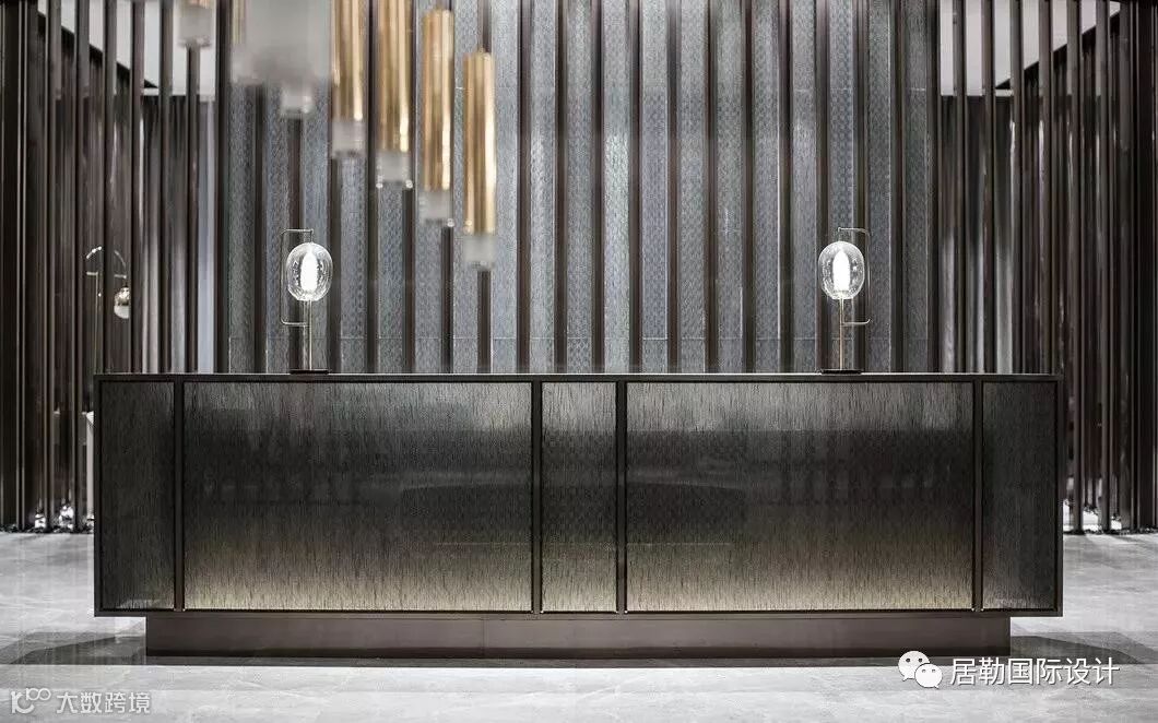 接待前厅是售楼处的第一观感,在此处,设计师选取了墨色大理石,凿出砚台的形态,对应传统院落的“天井”,内置涌动的水流,生生不息,亚克力与金属相衔的吊灯,将灯光弥漫开来,投映于水面,两侧金属隔栅与之呼应,左右对称,天地对称。