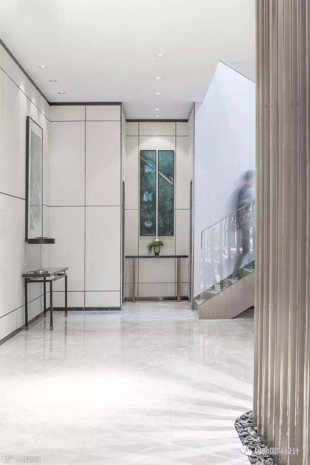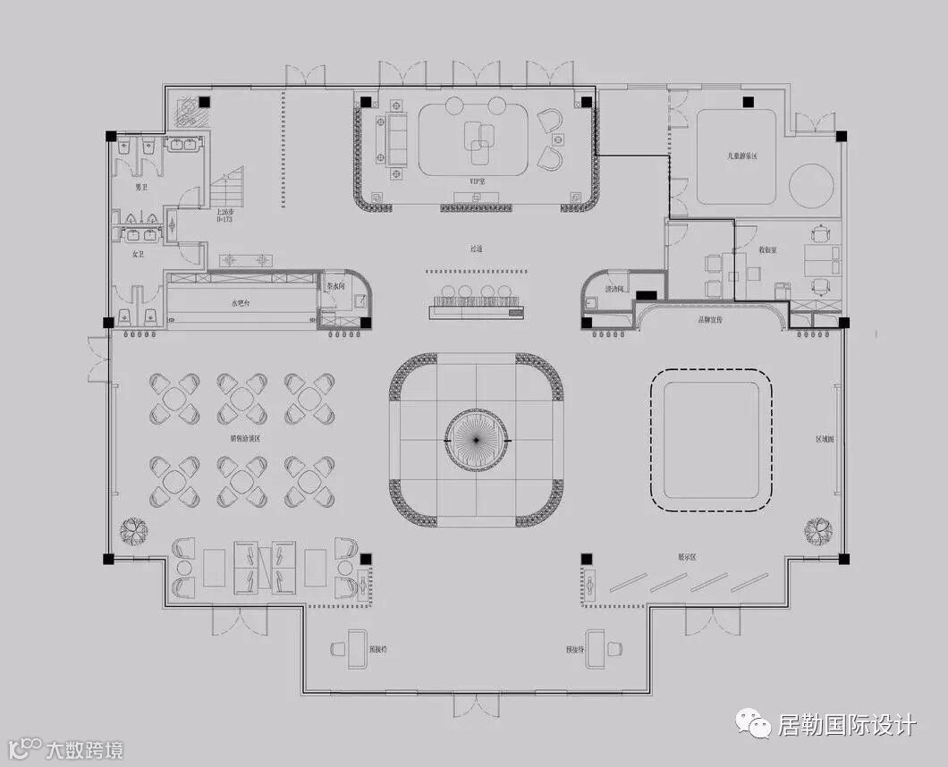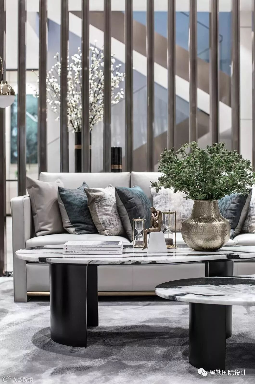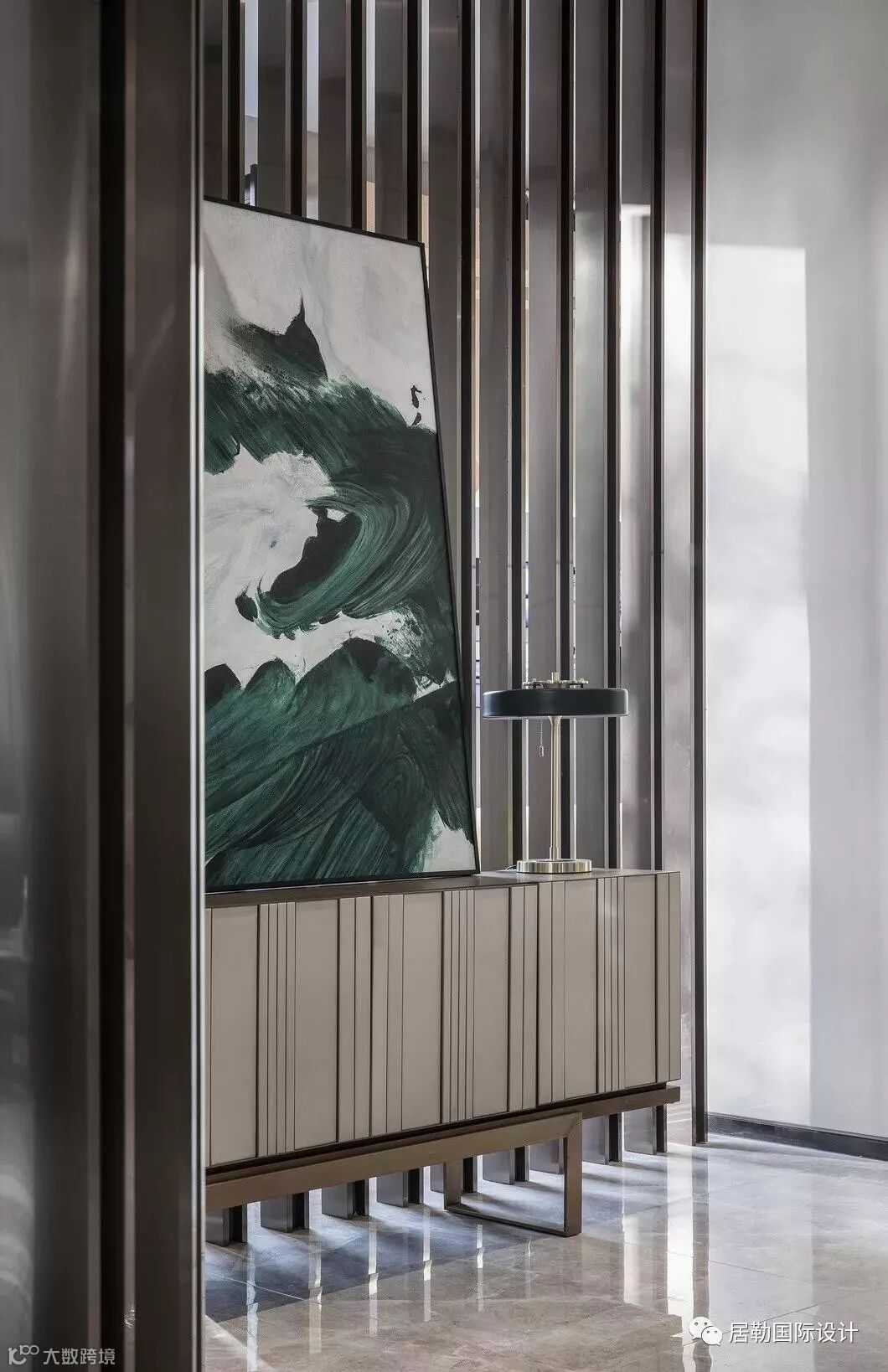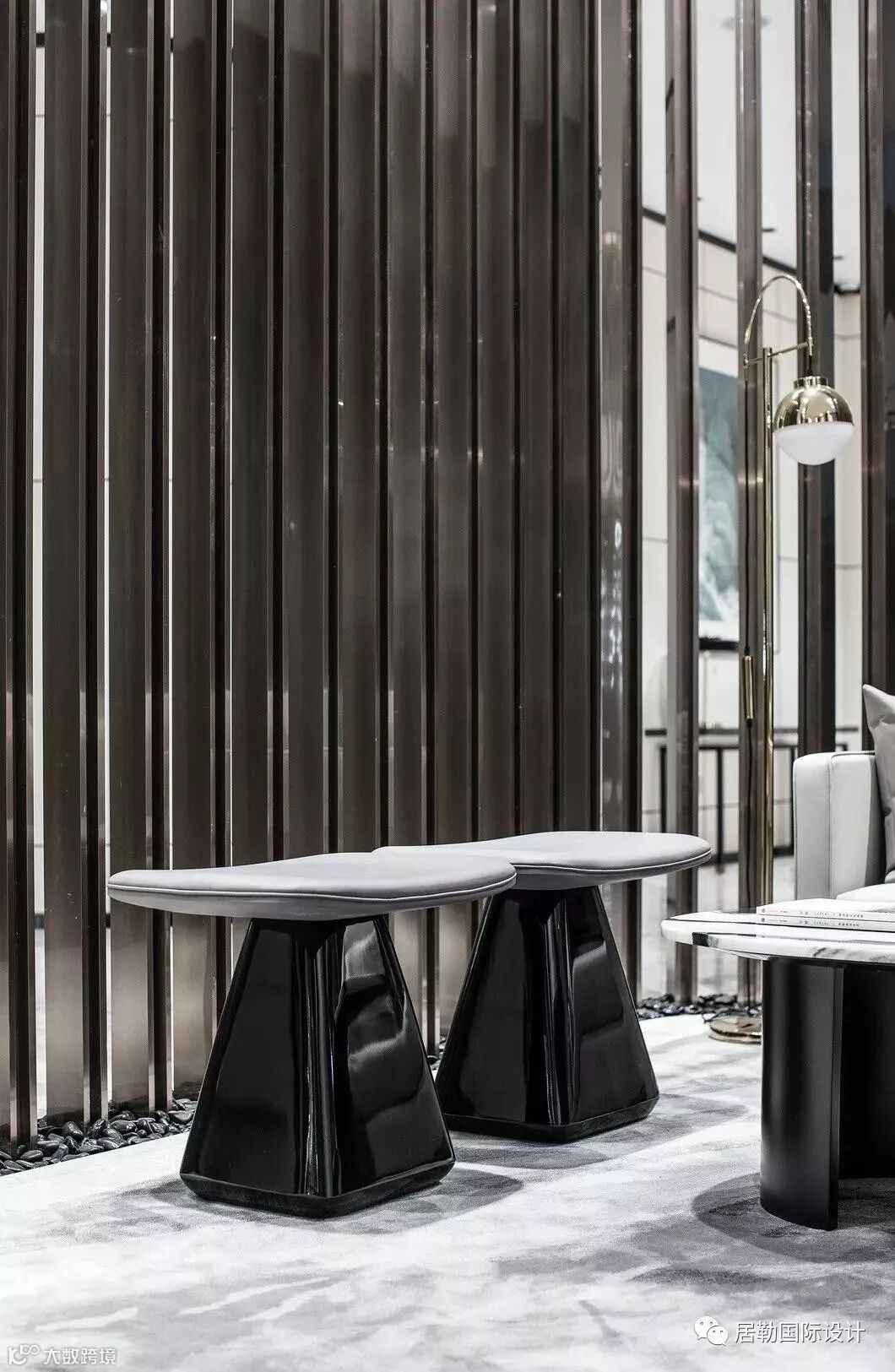 接待前厅是售楼处的第一观感,在此处,设计师选取了墨色大理石,凿出砚台的形态,对应传统院落的“天井”,内置涌动的水流,生生不息,亚克力与金属相衔的吊灯,将灯光弥漫开来,投映于水面,两侧金属隔栅与之呼应,左右对称,天地对称。