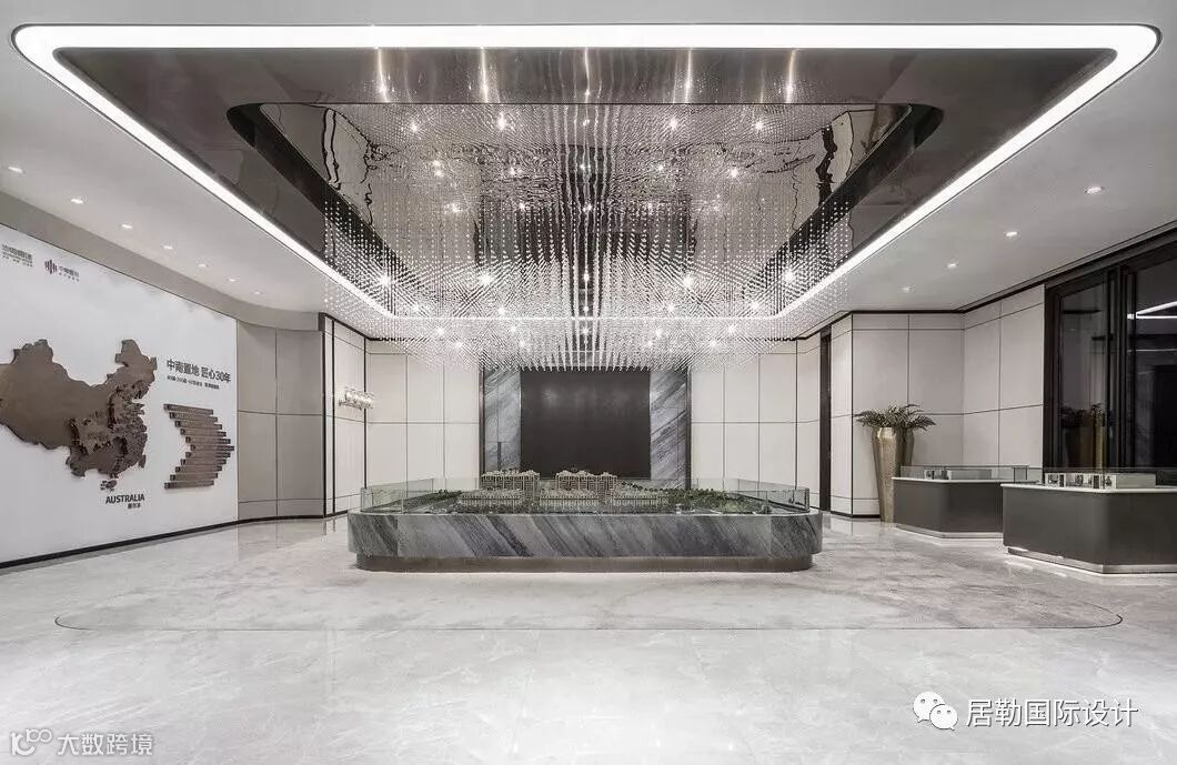 前厅左侧,是沙盘区,倾泻而下的水晶吊灯,仿佛一阵骤雨,以疏密勾勒出参差嵯峨的山之形影。顺着“雨水”而下,是散发的光线。去除冗余的繁饰,将空间让位于人行动线和整体的简洁。