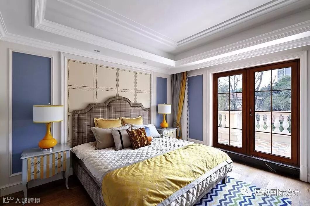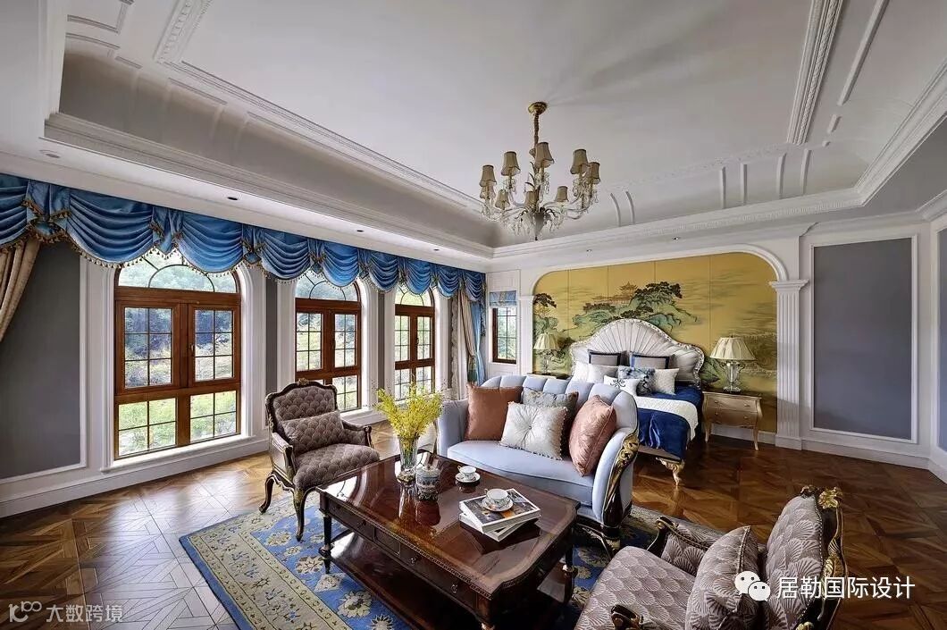 卧室整体色调以蓝为主,带有装饰的背景墙及法式风格的布料、家具、花纹的点缀,加强了整个空间的层次感。