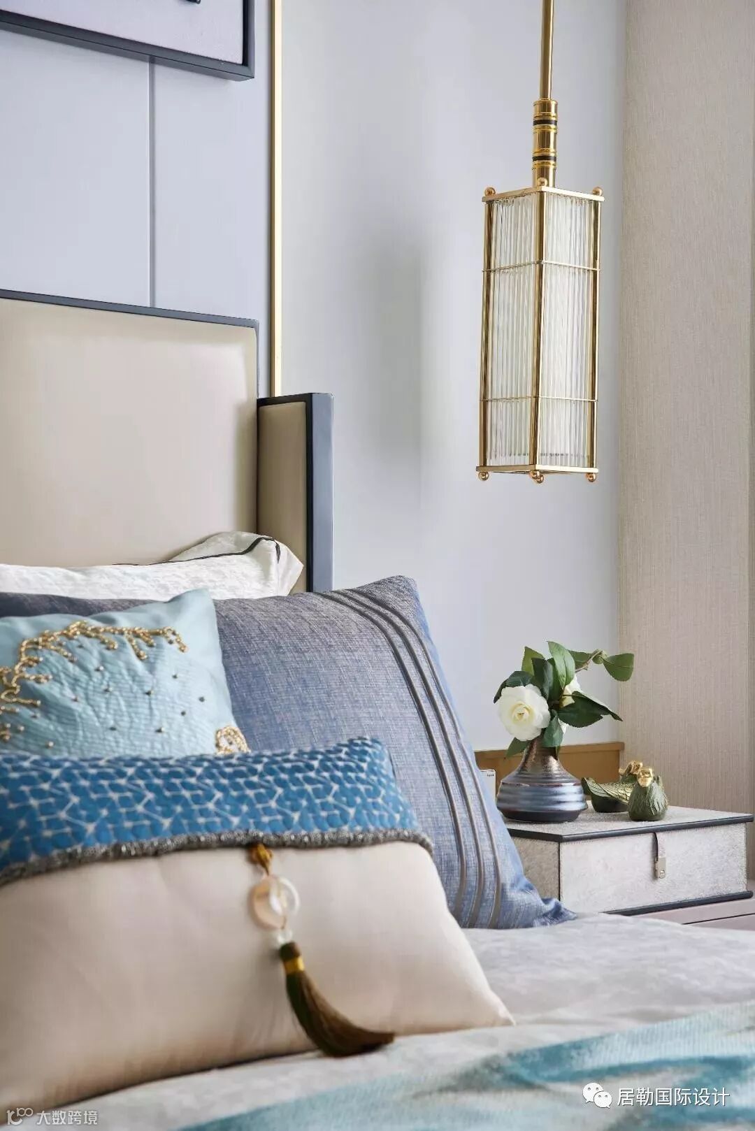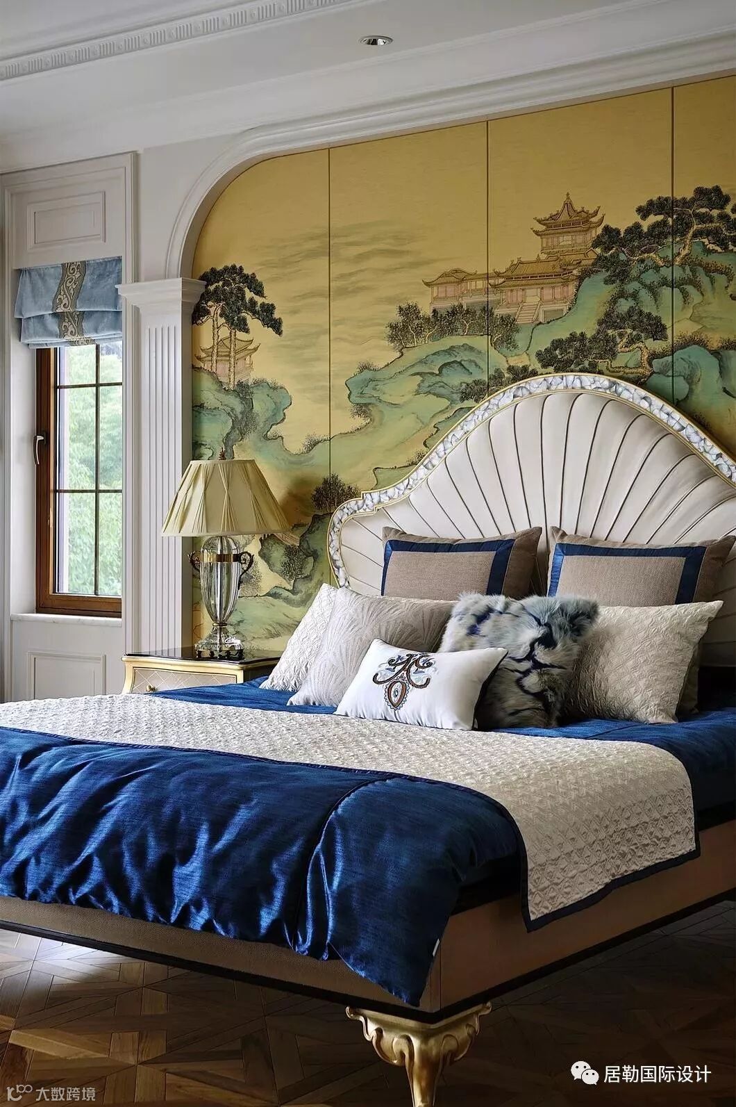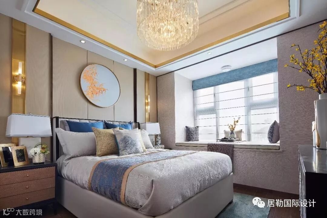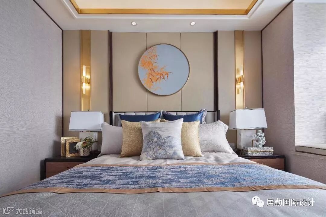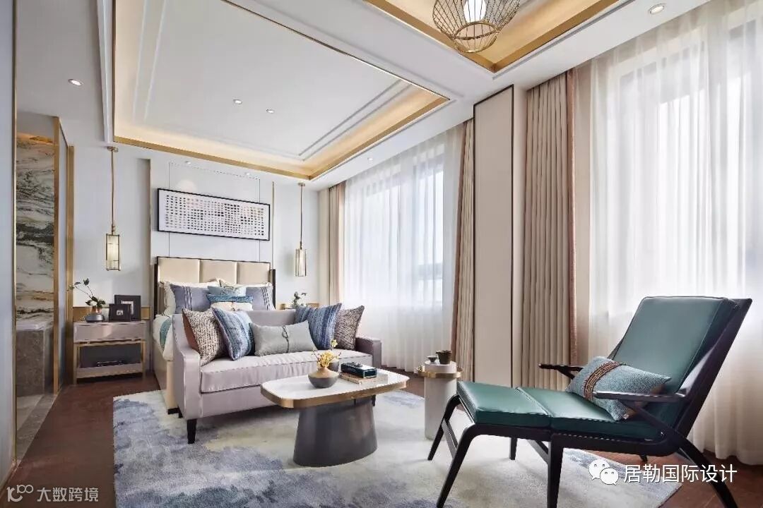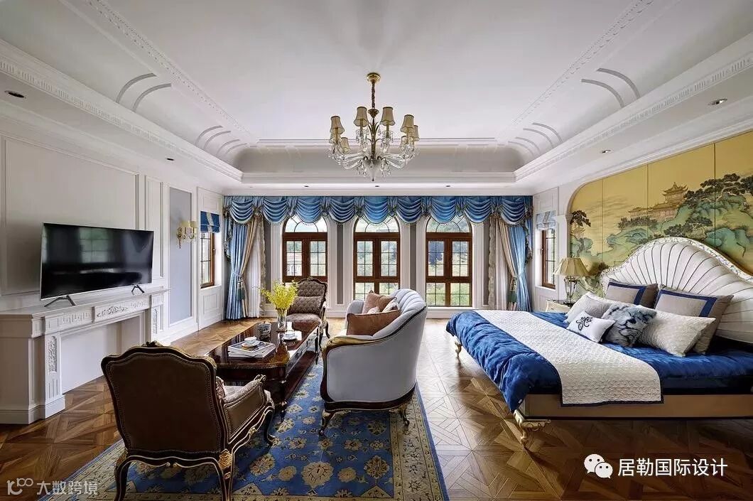 主卧,设计师再次将西方的浪漫旖旎与东方的灵秀典雅完美相融。蓝色的床品和帷幔,是空间里最为亮丽的一道风景,绒面的质感,将复古和低调的奢华渲染的淋漓尽致。