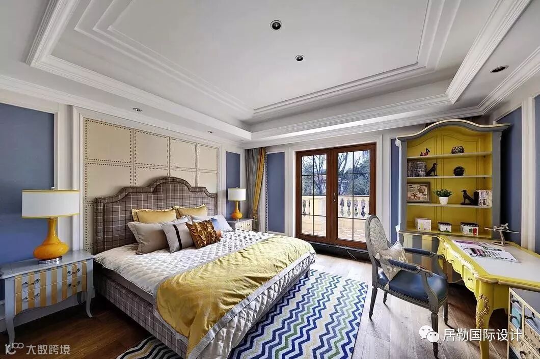 男孩房,设计师用个性相左的灰蓝色与黄色组合,碰撞中带来超强的吸引力。跃动的黄色在不经意间打破蓝色的含蓄,如同海上初升的太阳,柔和而灵动,充满着年轻的活力。