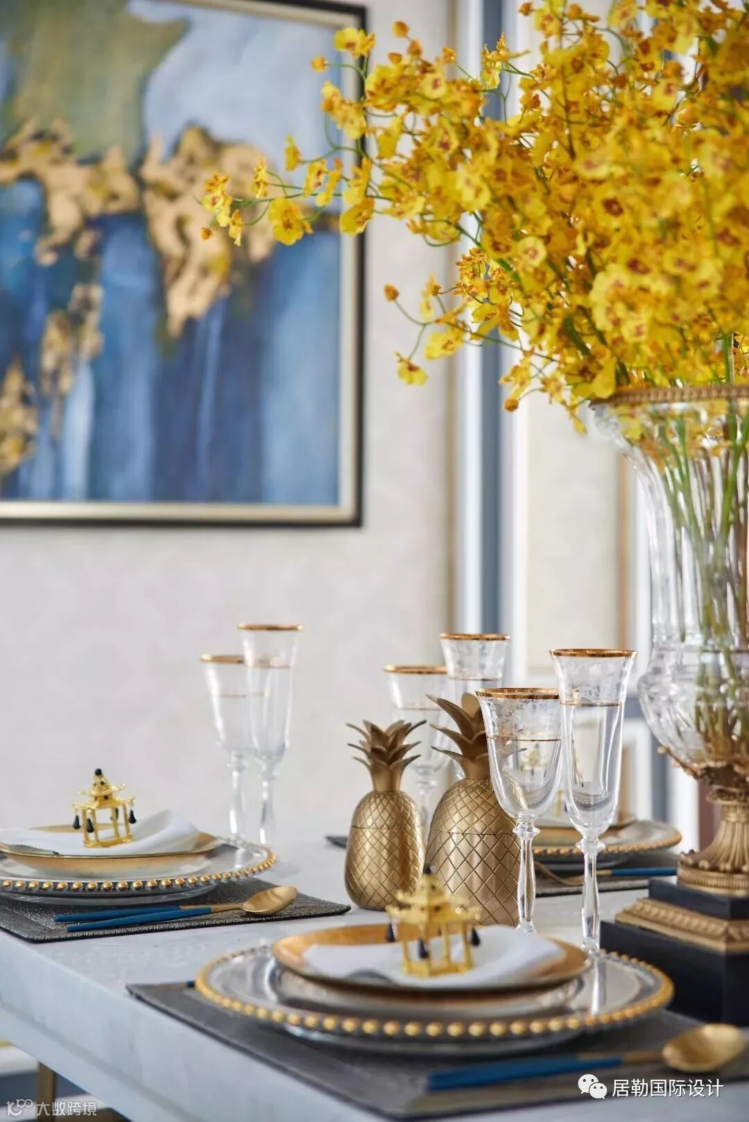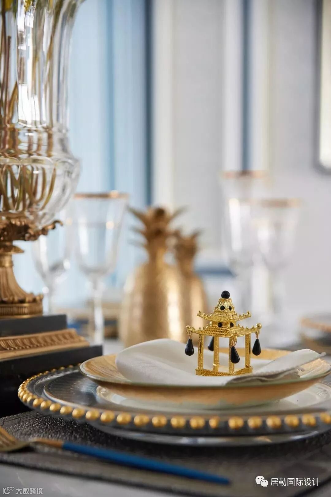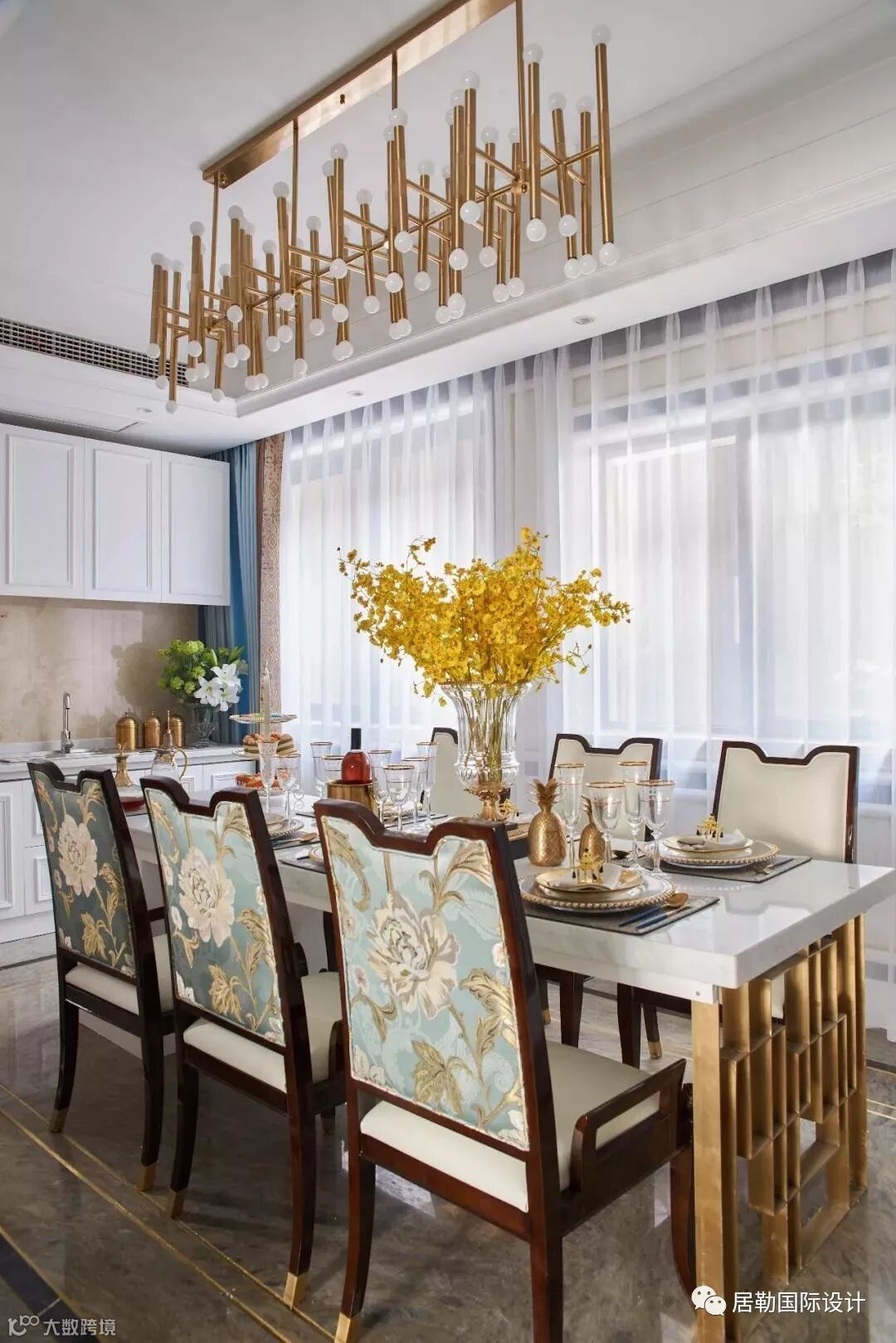 餐厅在家具、布艺纹理、质感等细节处体现出法式的韵味,同时还加入金色元素,色彩高级清爽,明快细腻。