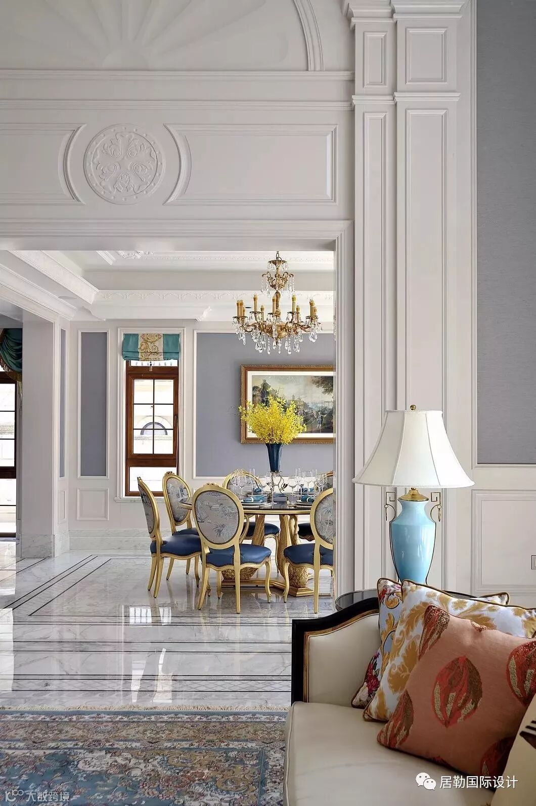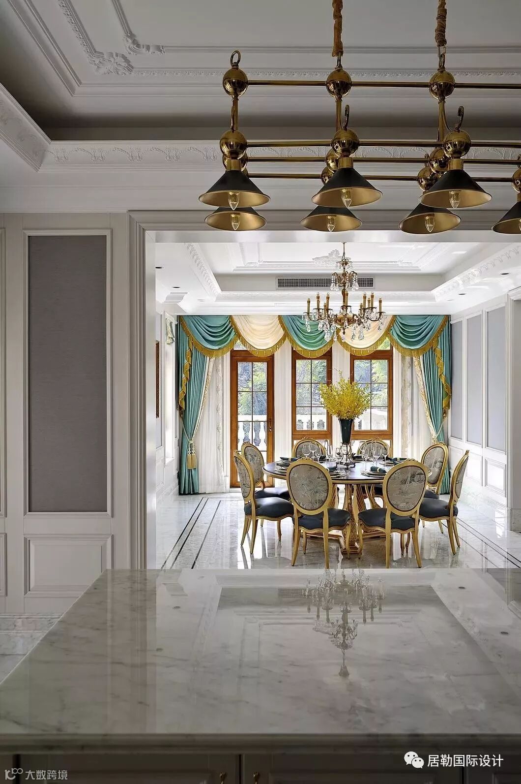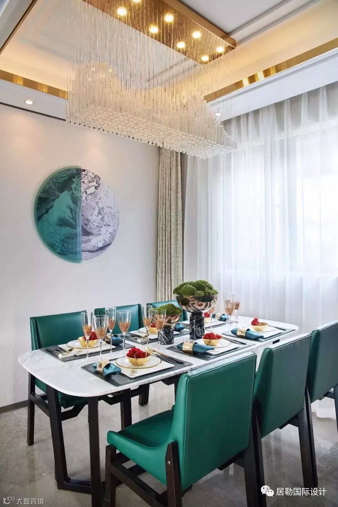 餐厅与客厅相通,新古典的乐章到达这里轻缓而悠扬,设计师用蓝色与绿色演绎轻奢之美,把“法式品味”无限放大,让人们在优雅的用餐时光里重温法式贵族情调。