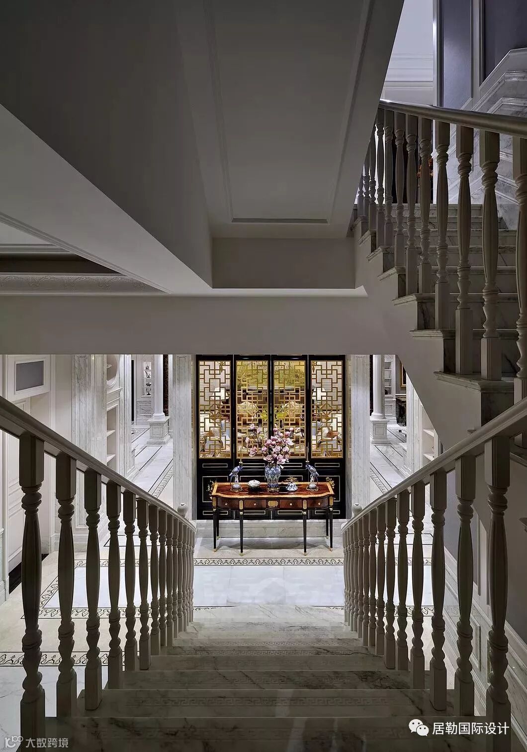 随着楼梯漫步而下,迎面的中式屏风后,是一个全新的世界。