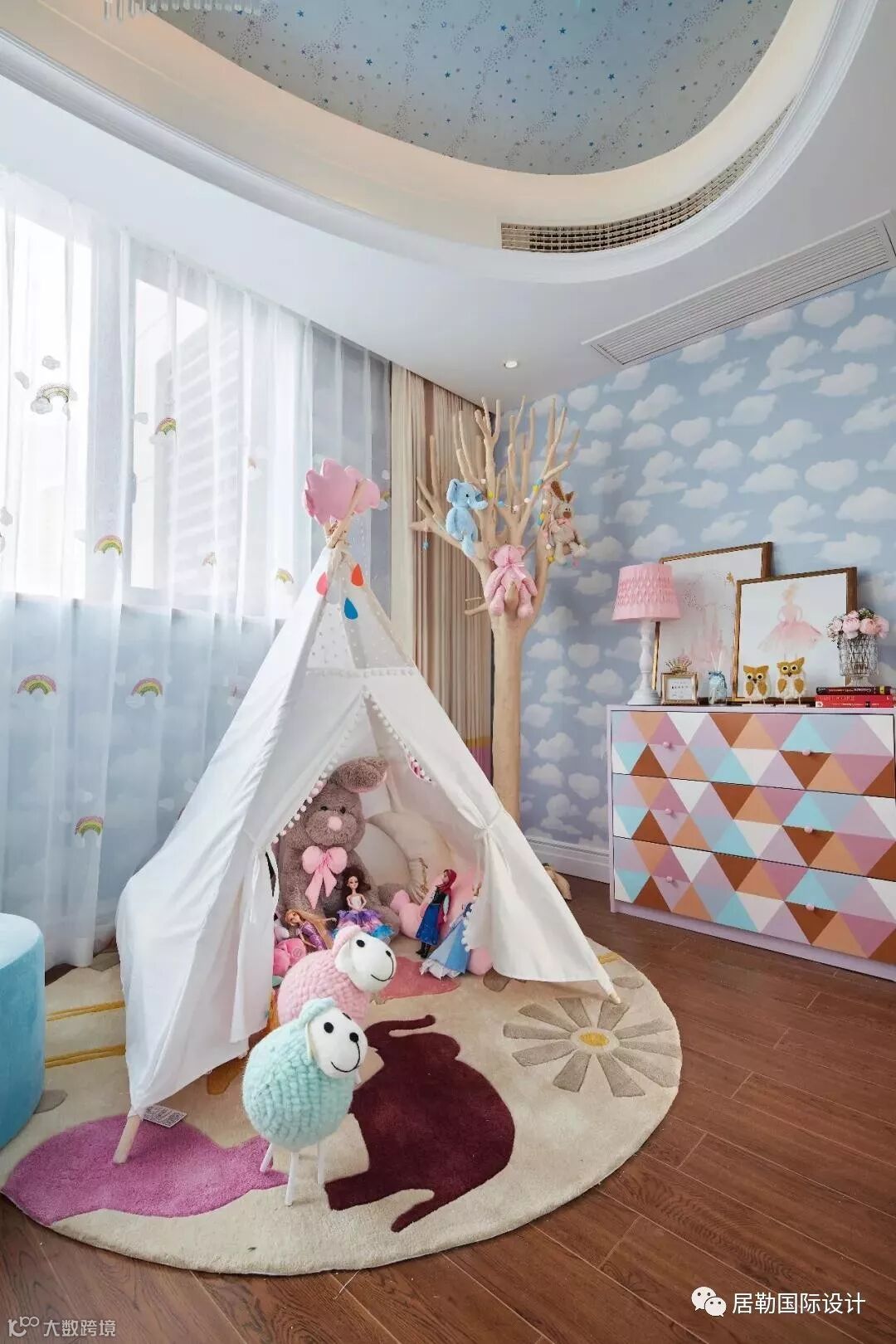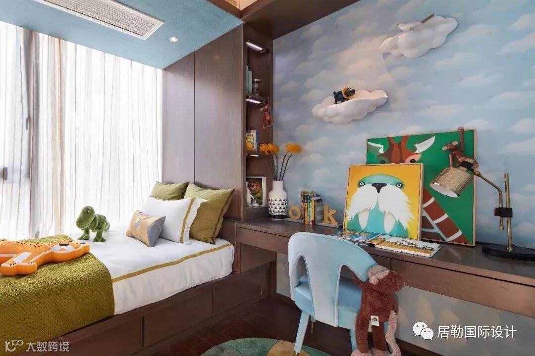 儿童房以童话为主题,颜色丰富轻快,背景墙花纹采用“天空和云朵”,给孩子充足的想象力。上下双层的床架让空间充满了童趣,极大的满足了孩子们爱玩的天性。