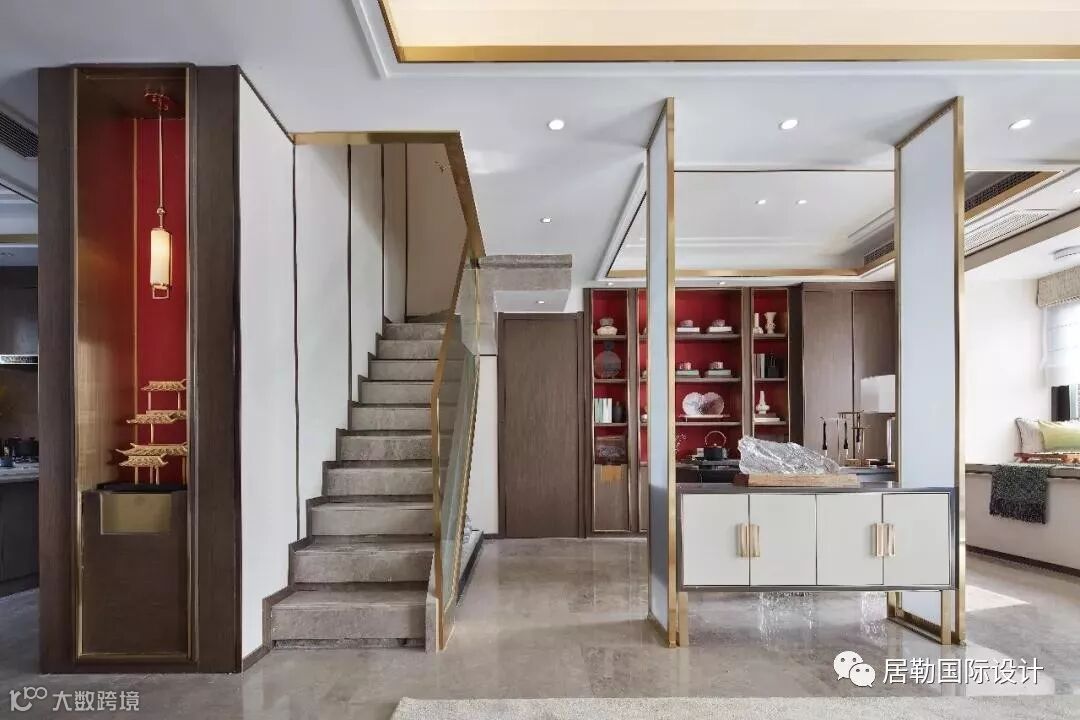 由玄关处进门可看见,镶有金边的透明清玻将整个空间分为客厅和书房两个区域,即区分了空间,达到空间的多个利用,开放式的书房设计又不会显得拥挤。这是对传统元素的解剖,更是对时代需求的诠释。