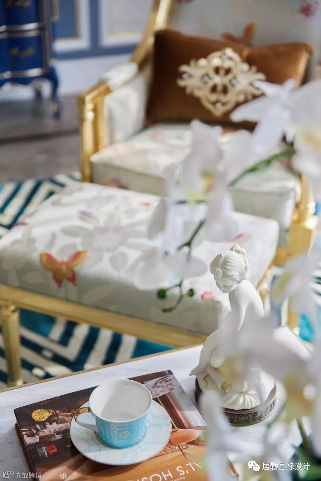会客厅一侧是品茶区,设计师采用了英式的古典家具,金色的灯具与帷幔妆点其中,空间精致而富有气魄。这一刻,时光仿佛回到了18世纪的某个午后,茶香中,一场贵族的聚会正在进行 。