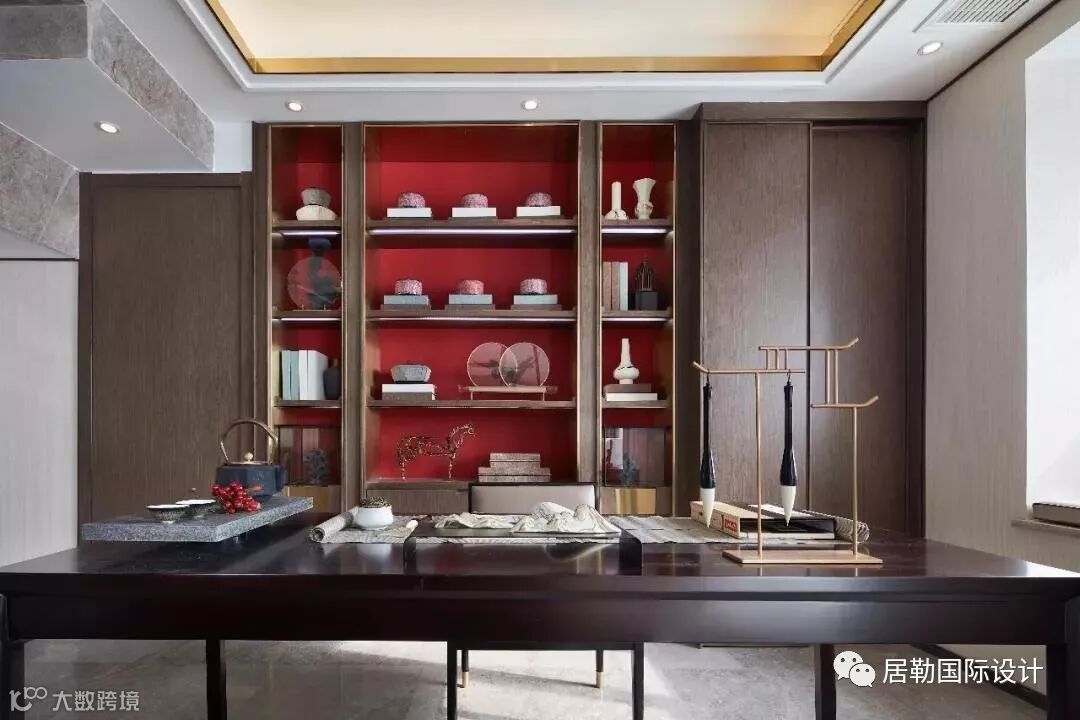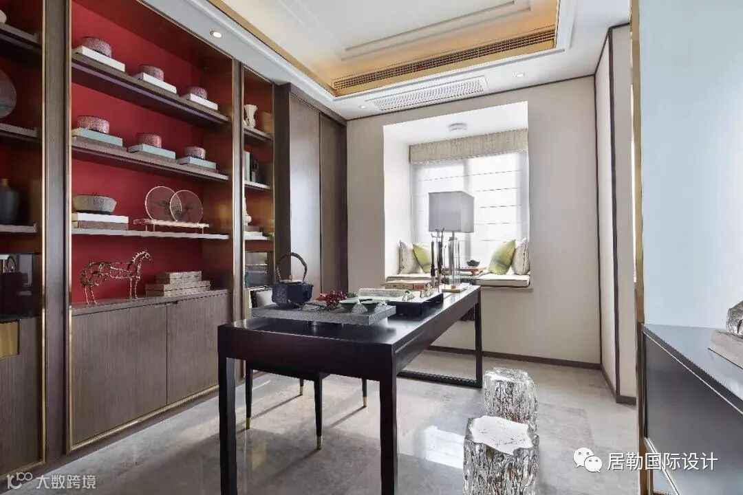 书房配以现代中式风格的桌椅、书架,用以深木与代表中国的红相结合,突显了主人的涵养与学识。