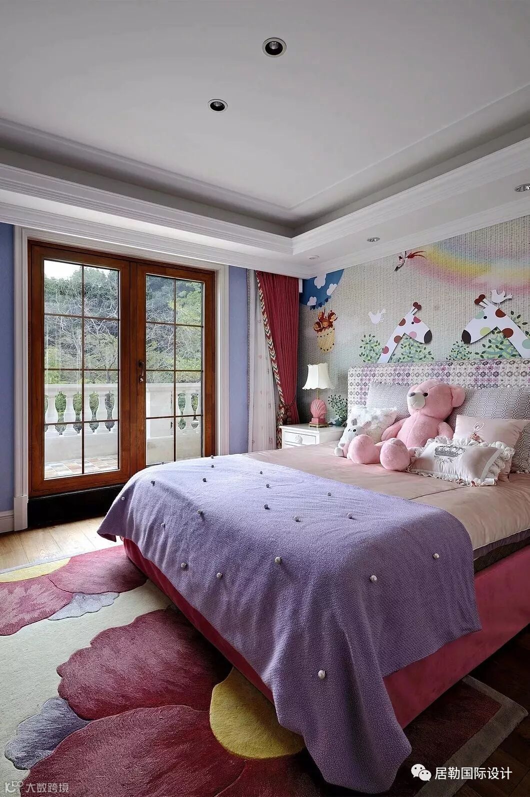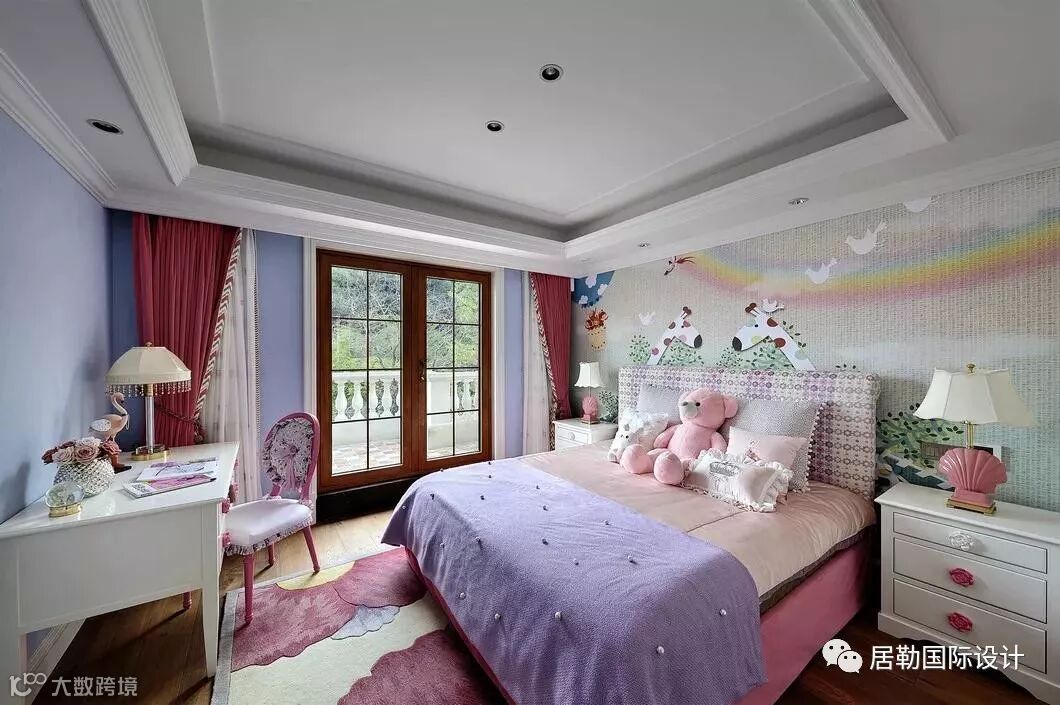女孩房用粉色和紫色奠定梦幻基调,以贝壳、火烈鸟、卡通墙纸等元素,打造充满童趣的空间。
