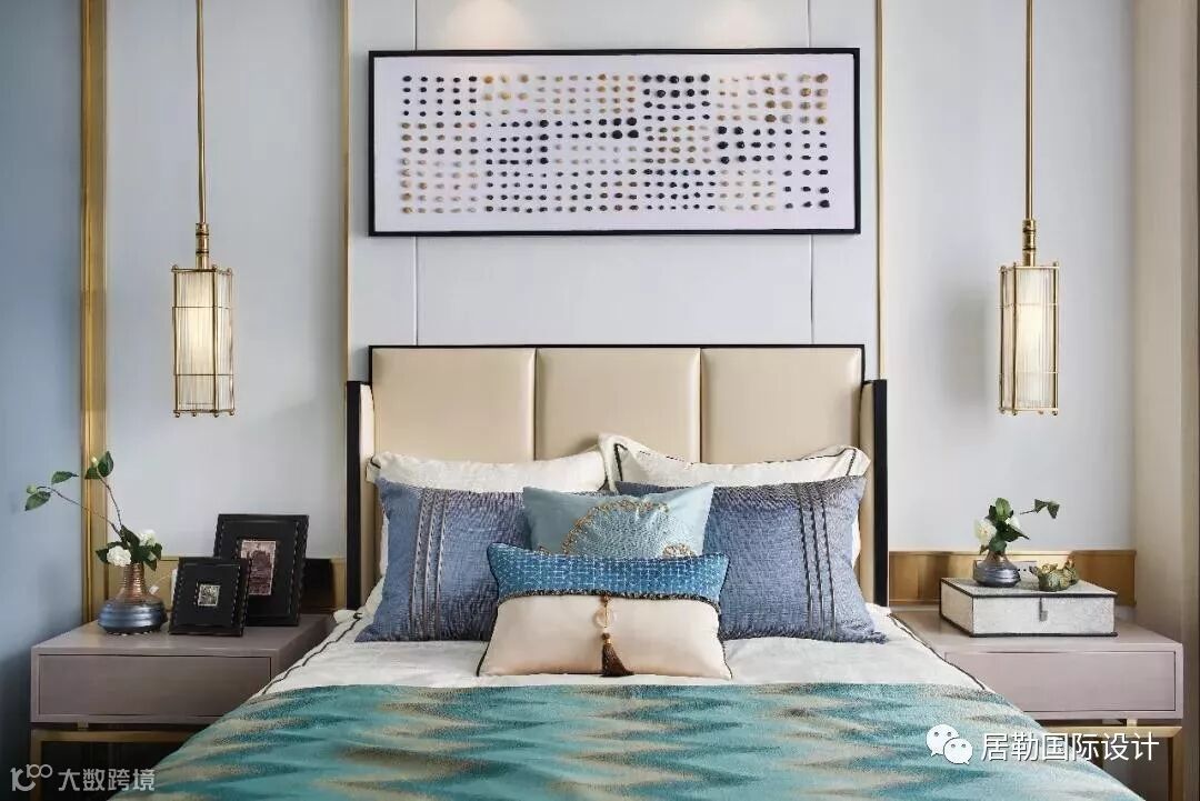 卧室整体色调以蓝、绿为主,暖黄色的灯光自上而下调和着整个空间的冷暖对比,干净、舒适又不失色彩。再配以金属边框和黑白的背景字画,在不显凌乱的基础上,恰到好处的增加整个空间的层次感