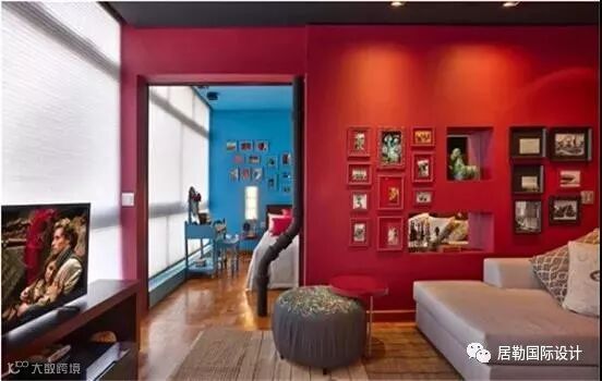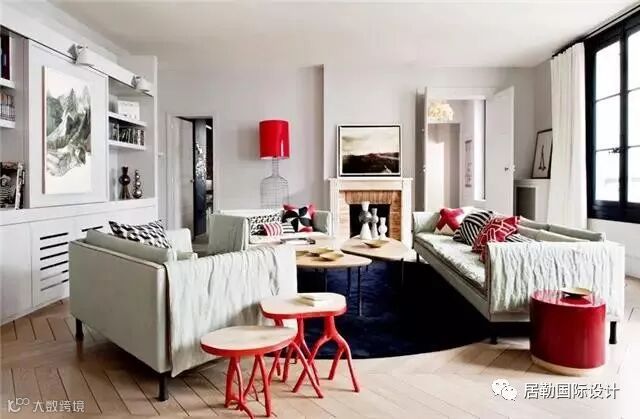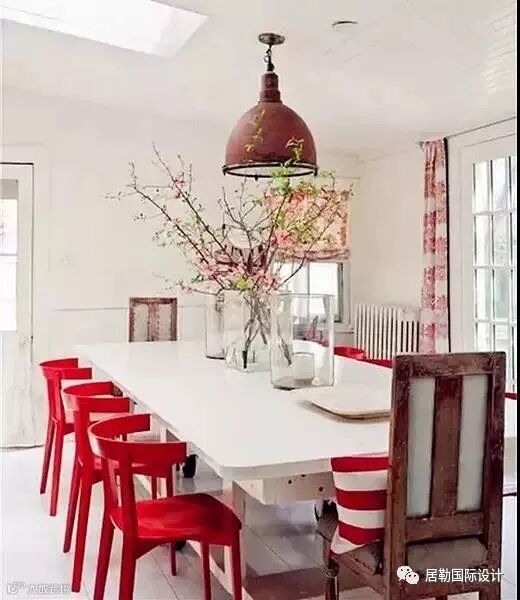 如果家里的墙面是浅色调,那么可以考虑搭配大面积的红色家具,比如红色的沙发、桌椅和窗帘等,形成场域的点睛之笔。