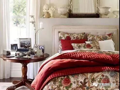 房间里的其他家居用品选择低调百搭的纯色,比如黑白灰、木色;然后用一两件红色的床品、抱枕、台灯、花束,来为空间添彩。
